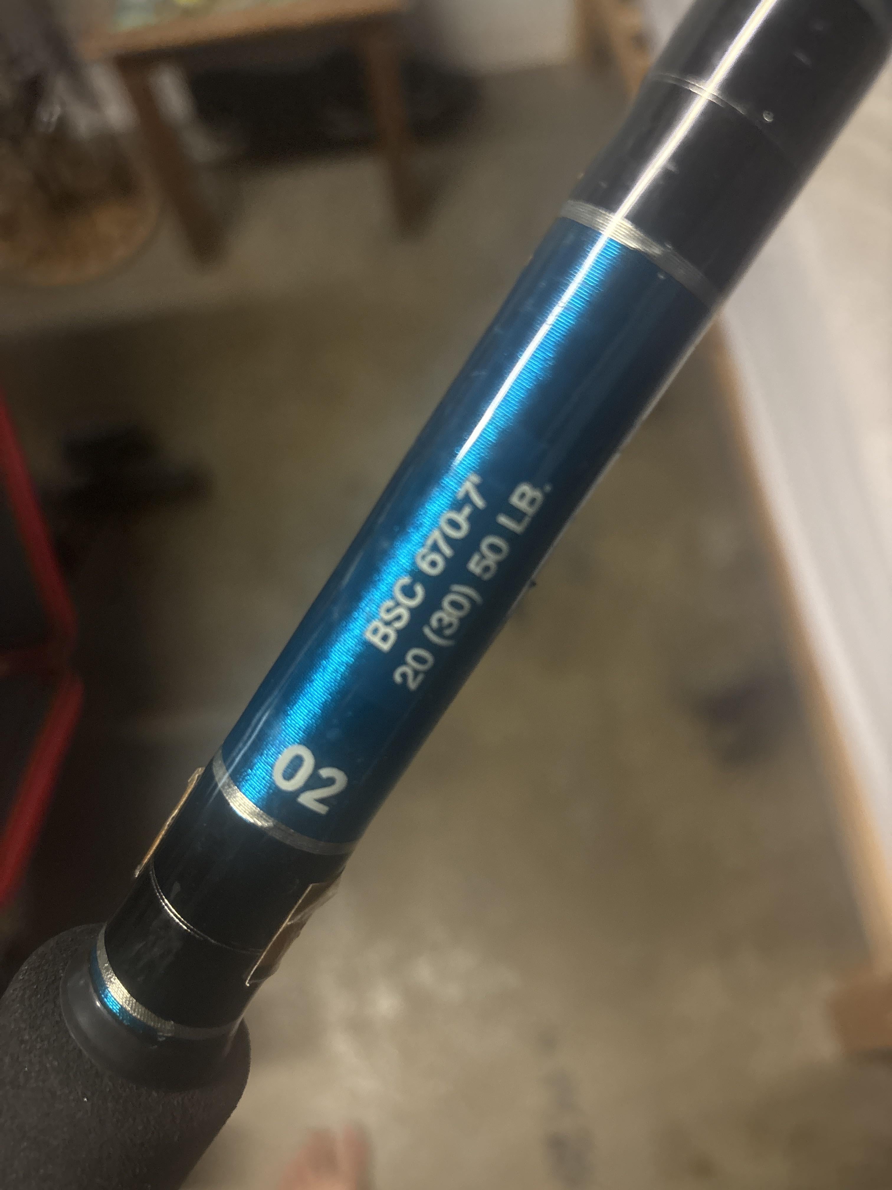 7ft 20-50lb line have a Daiwa saltist 40h spooled with 40lb braid on it. E-glass rod. Posted by domelegend101