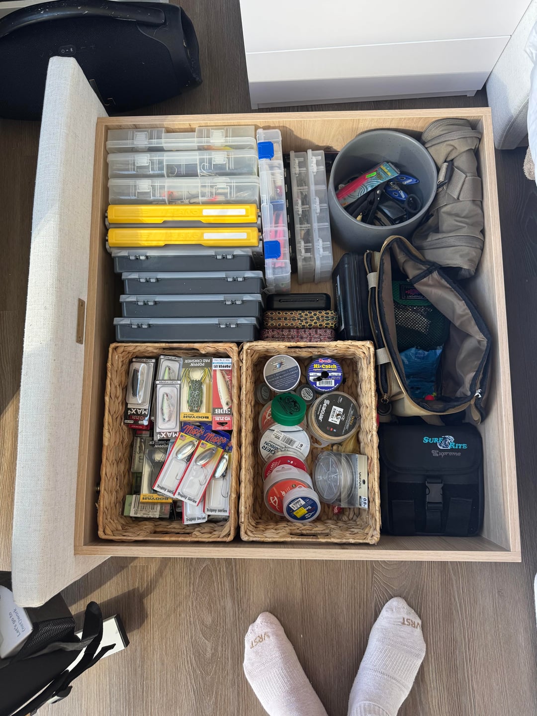 All my gear lives in my bedroom. A few more items tucked away in the closet but generally all of it is here under my bed or on display on the rod rack.