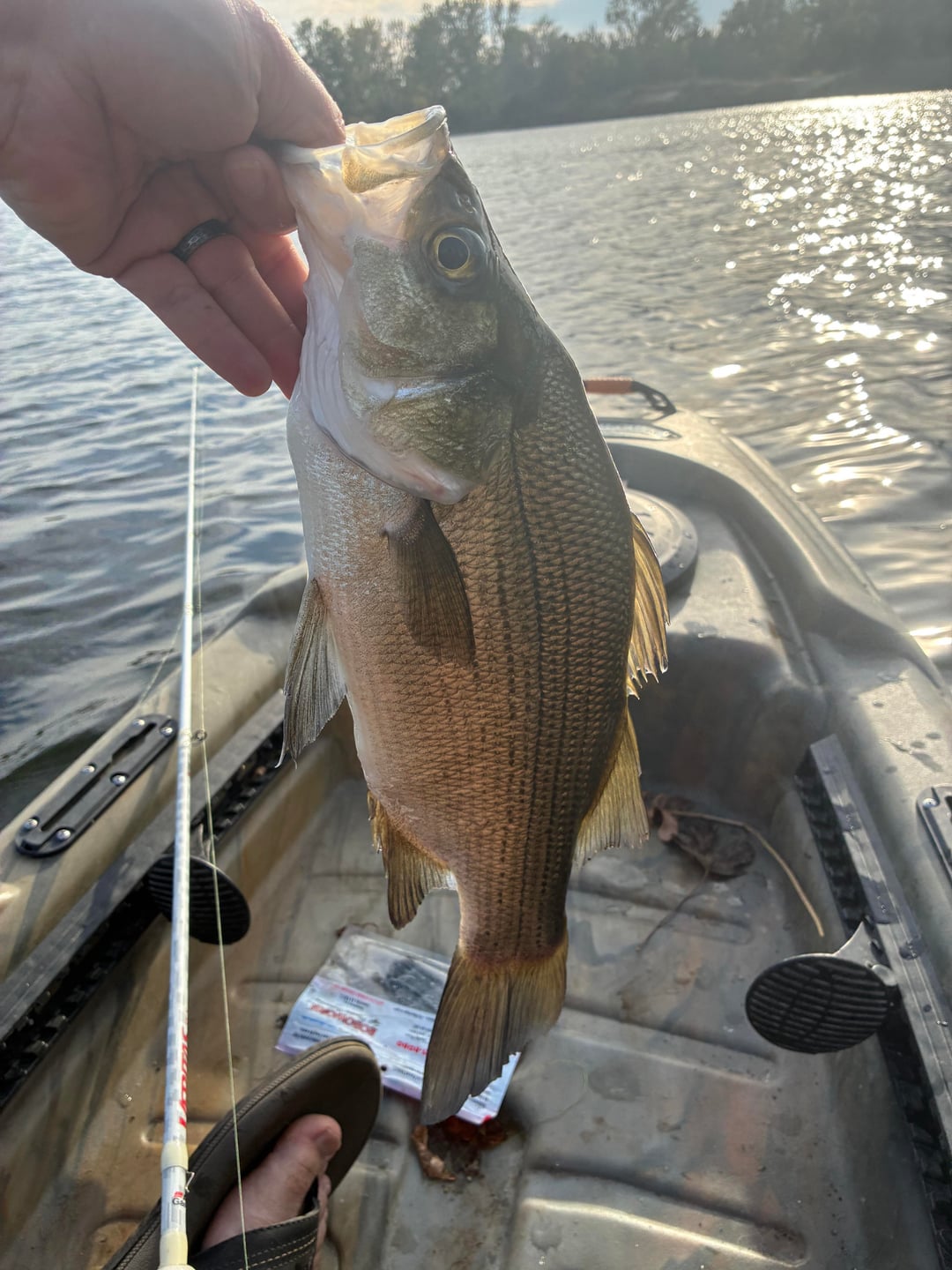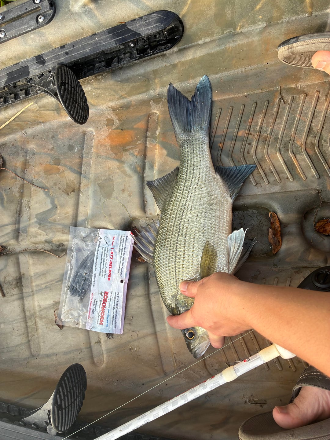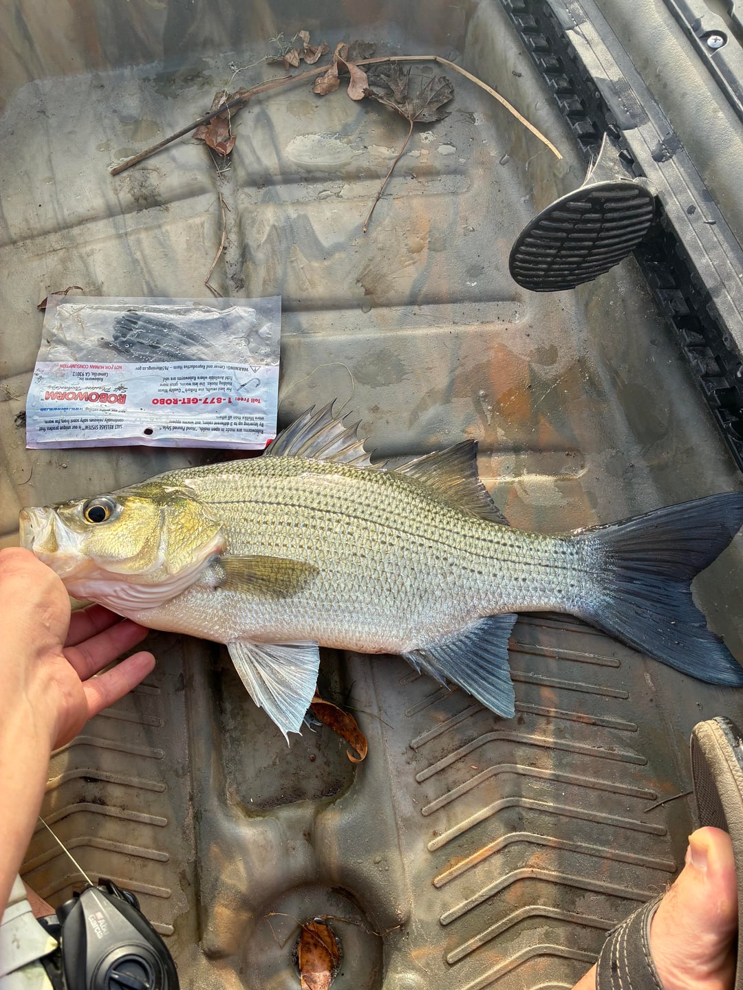 White bass, also known as sand bass (or sandy) down here in the south. One of my favorite fish to catch, they fight so strong for their size and they run in large schools, so when you catch one, you can catch a BUNCH if you stay on them. They are always chasing shad schools so they are always on the move. Pretty good eating too! Just make sure you flip the fillet over and cut off the red stripe.
