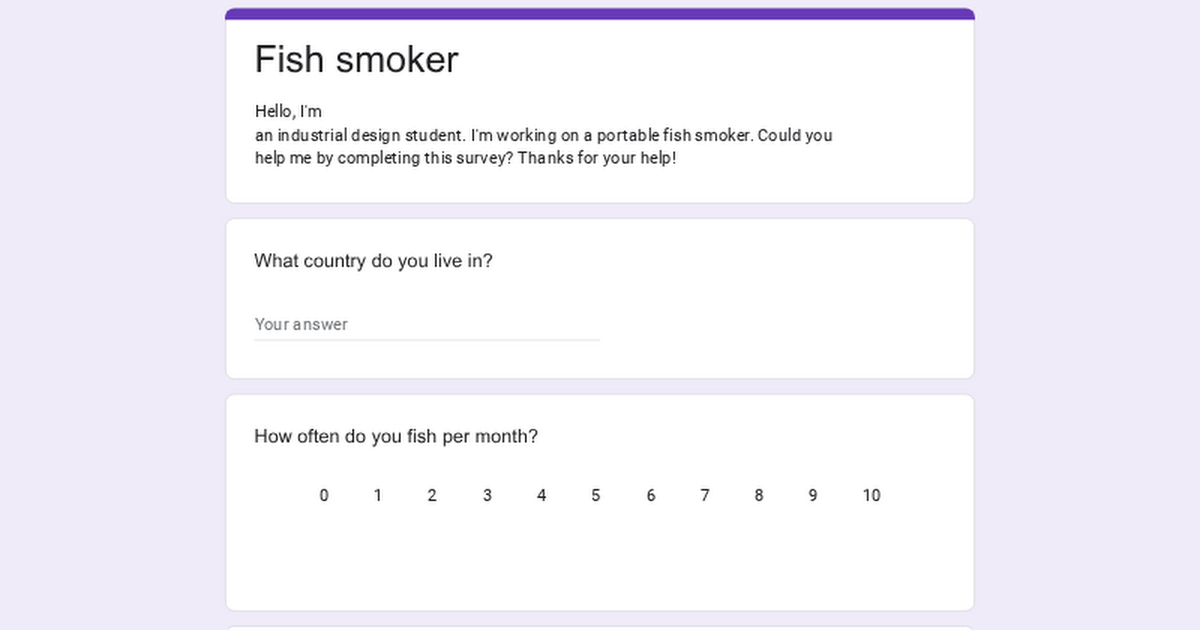 Hello, I'm an industrial design student. I'm working on a portable fish smoker. Could you help me by completing the survey below? Thanks for your help! https://docs.google.com/forms/d/e/1FAIpQLSdtCLJuR0F9c9pTdyy9uK0BRTZ-h9oDS-1gJ8nUgX4yYTO15g/viewform?usp=dialog Posted by AssignmentValuable88