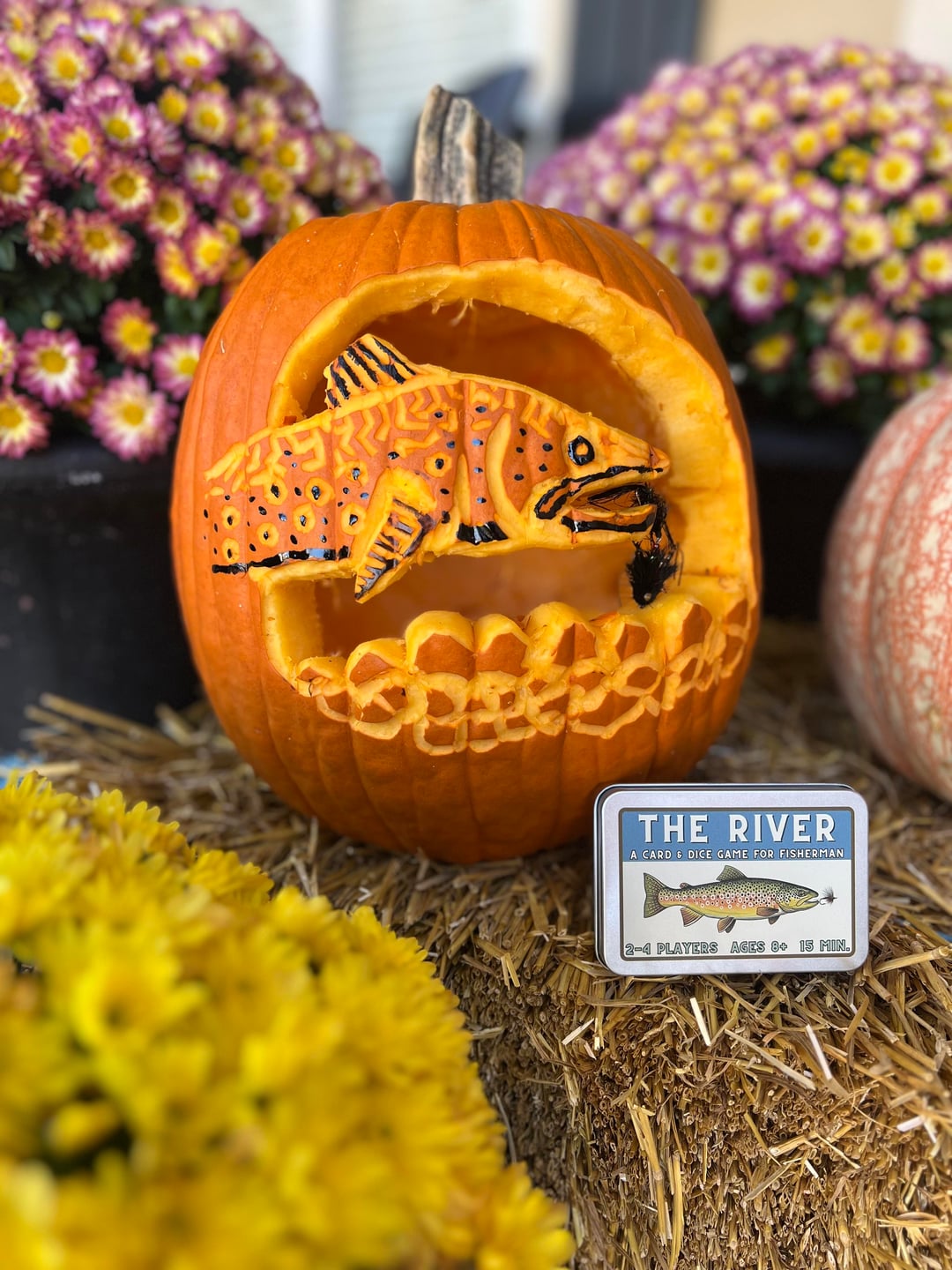 Carved a pumpkin of a brook trout (w/ a streamer in its mouth) in celebration of our fly fishing-themed card & dice game going live on KICKSTARTER. Chose to carve a brookie as they are native to our local waters