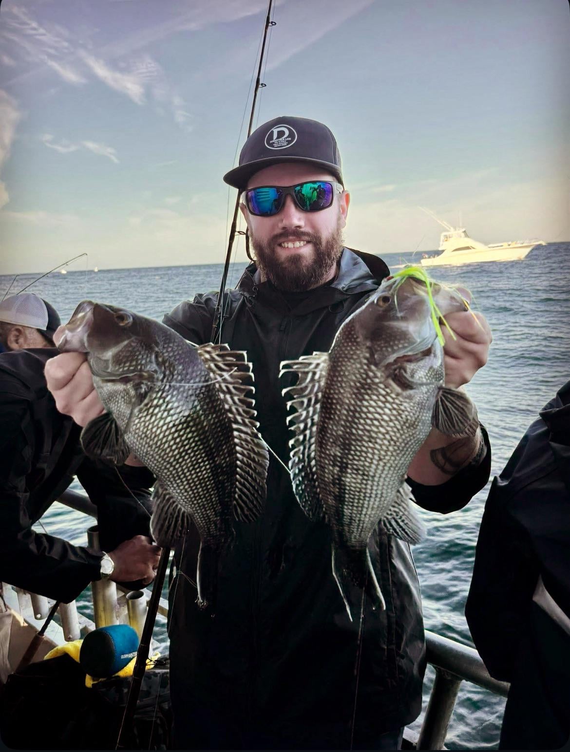 A nice double I pulled in last weekend on the hi-lo rig! Berkeley Gulp Pogies – “Smelt” color on Green Hi/Lo Sea Bass rigs dominated the day. Easy limits for 20+ people, all different types of baits/lures/rigs, over about 8 hours.