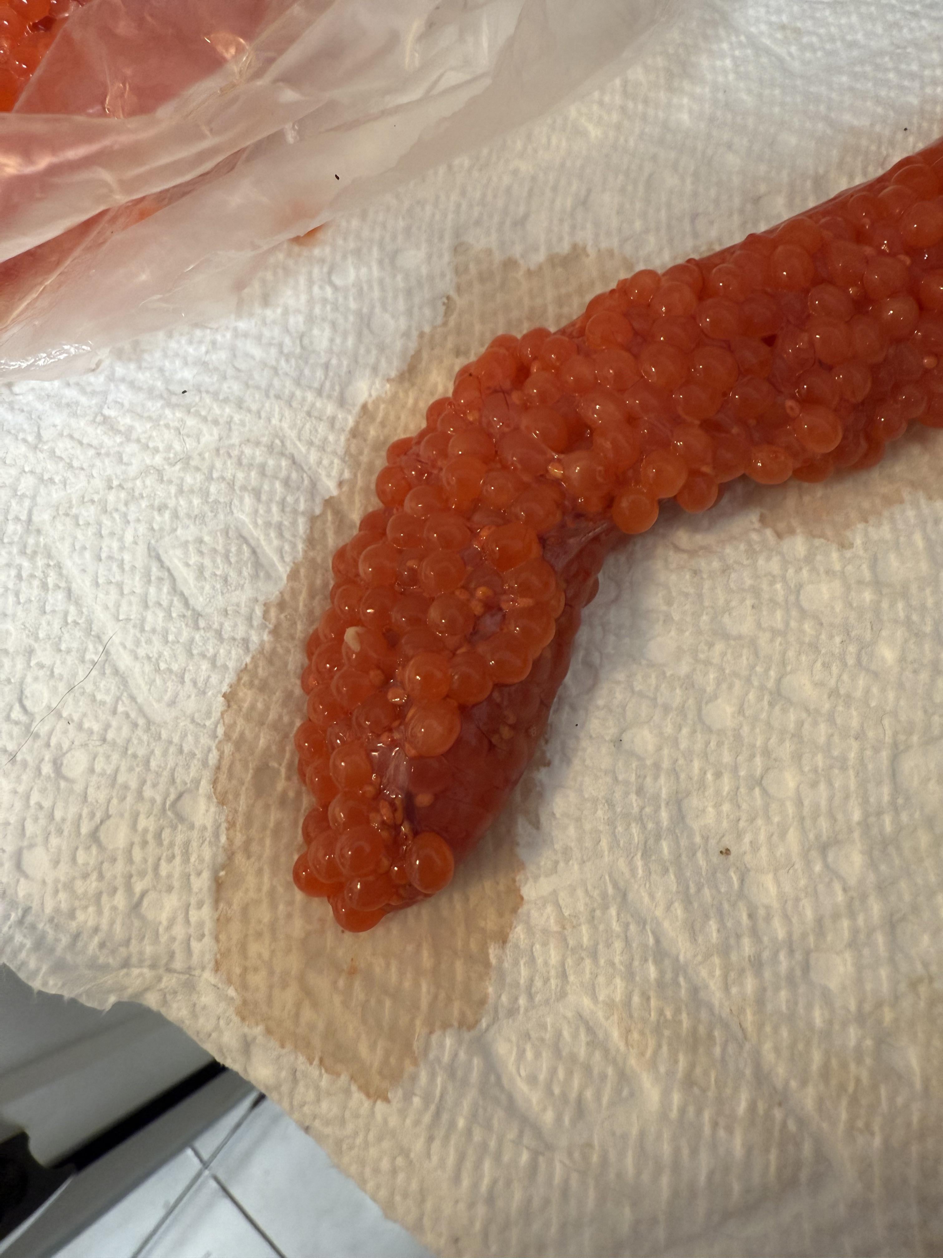 Hello I’m wanting to cure this roe for bait and wondering if these little white spots are going to affect it. Not sure what they are. Should I toss this or is it okay to cure? Posted by Character_Paint5504