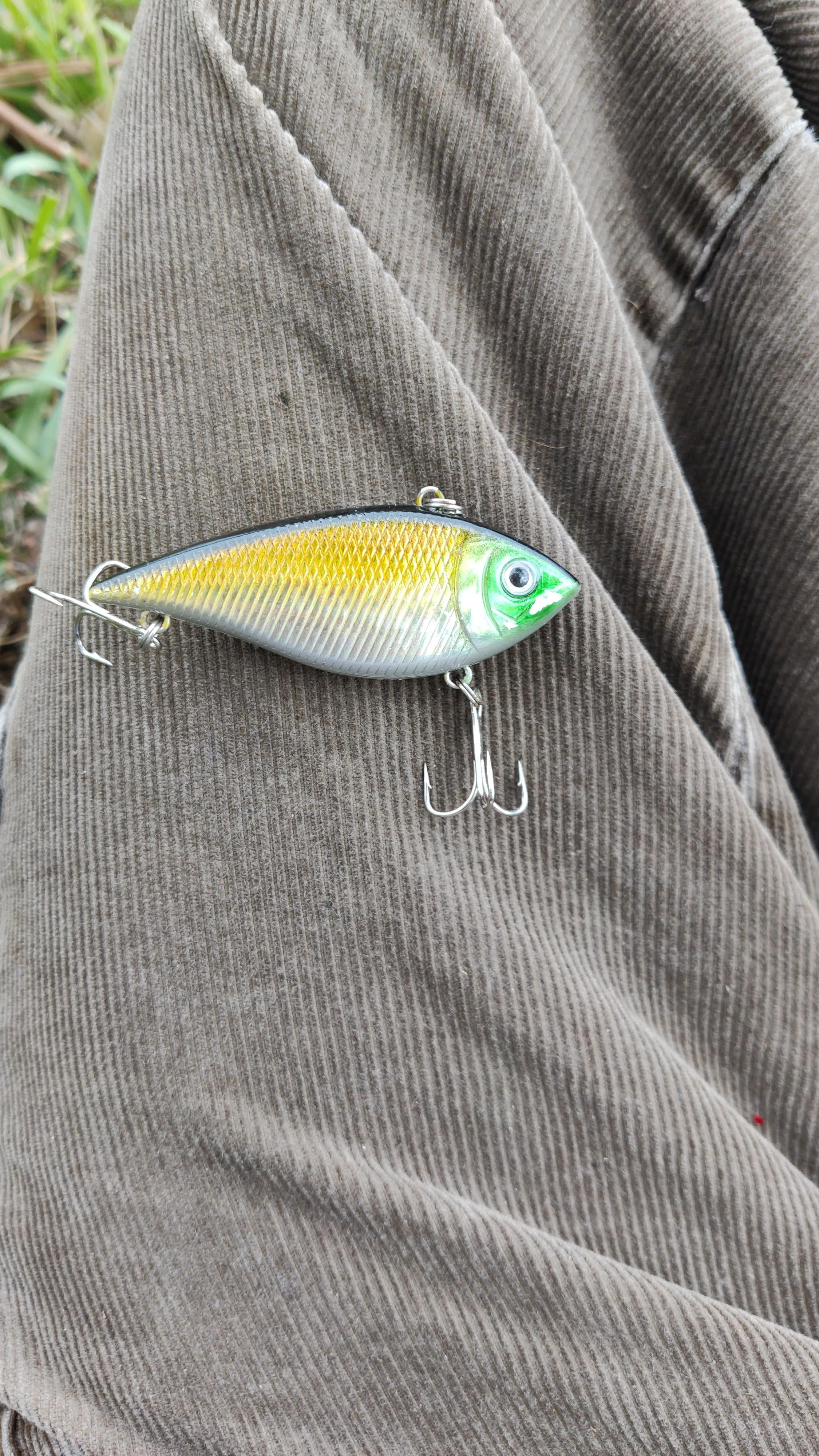 Search bait / rattle trap. Great for when bass are on the move and you need to cover a lot of water. Typically these things shine in spring and fall. Avoid bringing it through vegetation like grass and weeds, but it will rip through if you want it to. Bouncing it off rocks and trees is a good thing. It noses down and shimmys on retrieve.