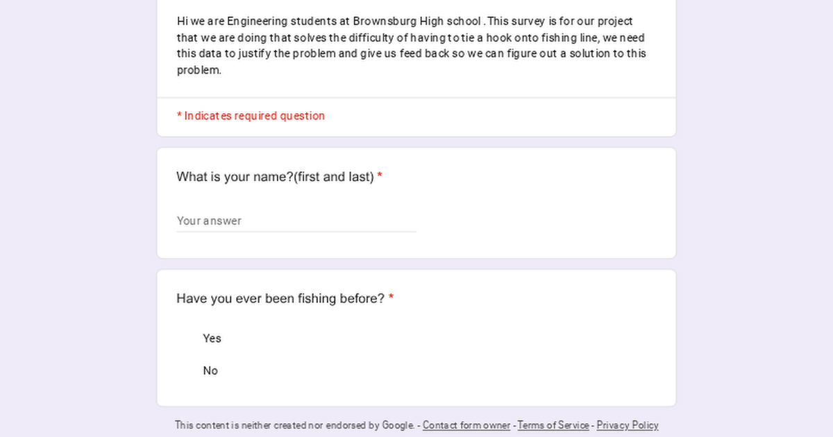 Hello, we are a group of highschool seniors in an engineering design and developer class, set out to make tying fishing hooks more efficient and environmentally friendly. It would be a great help to take our survey to hep us gather research!