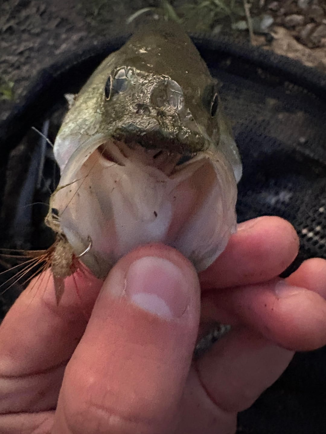 A foam dry fly that I smacked the pond with. Was fishing for bluegill but this guy wanted the bug!