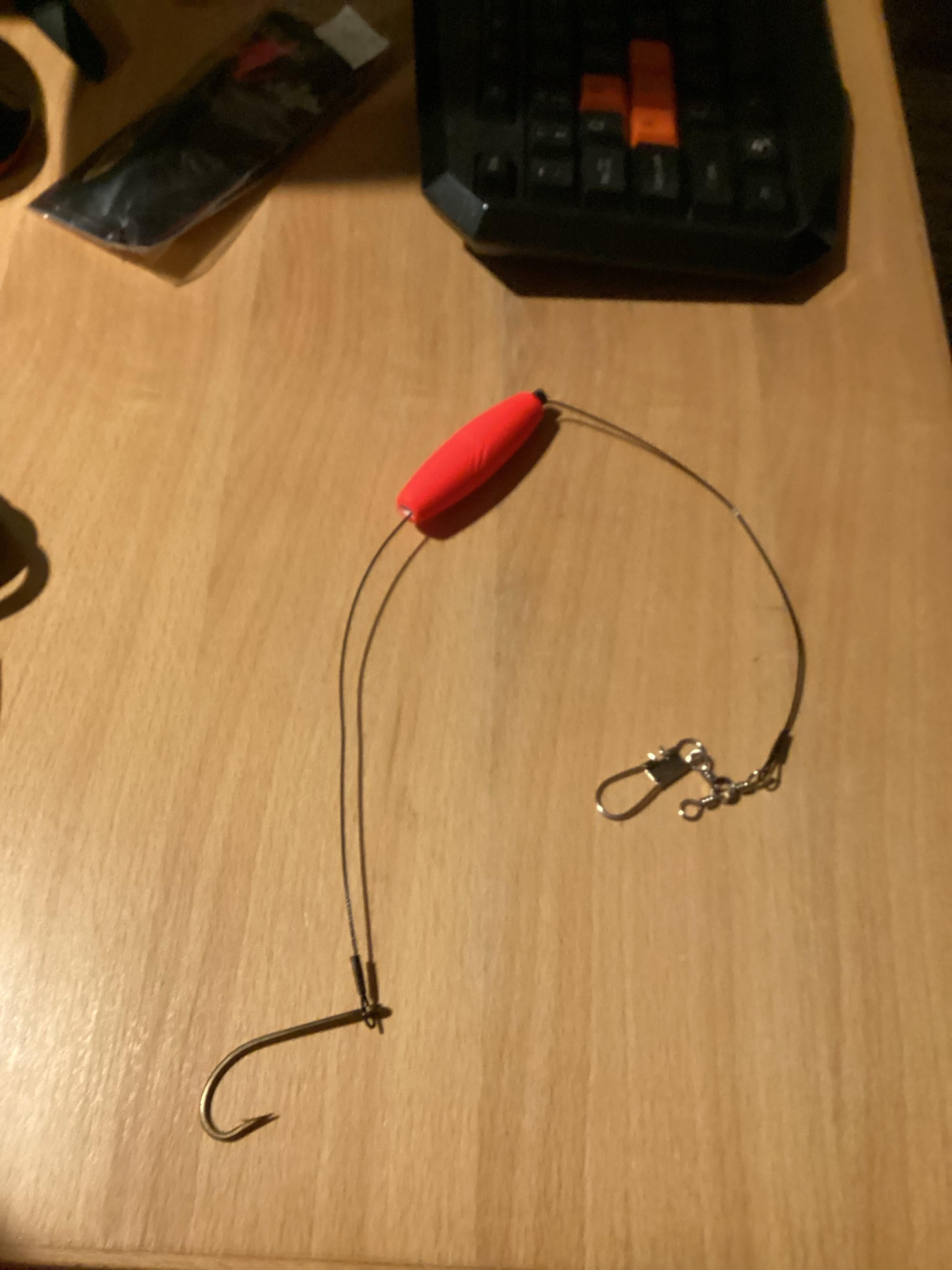You attach that to your main line, clip on a sinker or spoon to the swivel, then hook your baitfish or chunk on the hook. The red float keeps it up a bit so bluefish dont bite through your leader instantly.