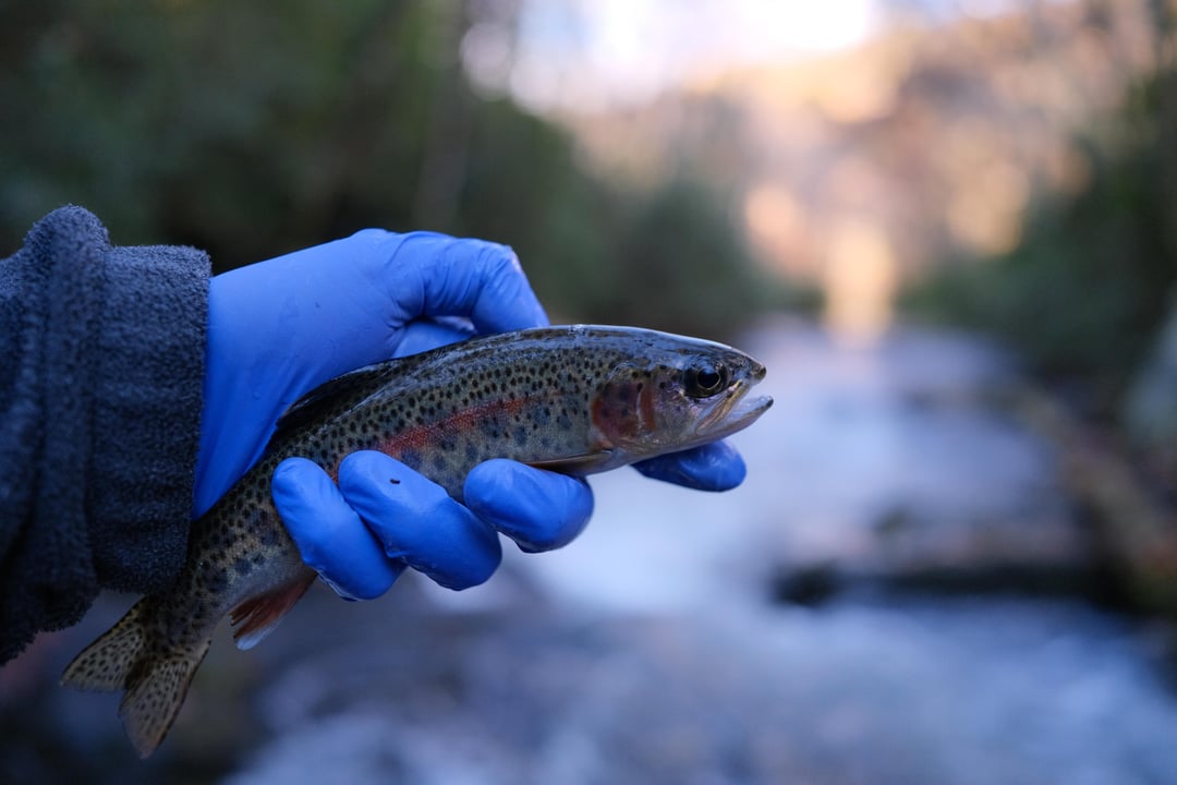 Landed my PB; Beautiful buck rainbow. Released healthy. Rocky, weedy, snaggy creek and 6lb test made for a hell of a rodeo… Not sure what he weighed but the measurement from the crease of my curled hand to the top of my tattoo is 12”. Northern Ca.