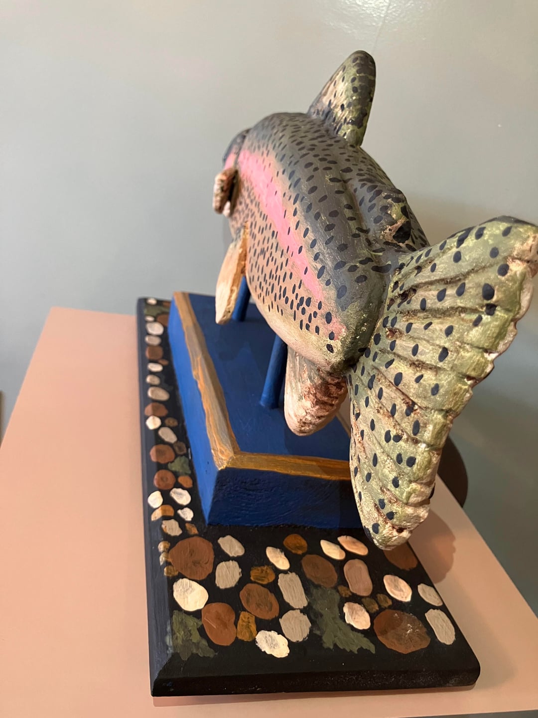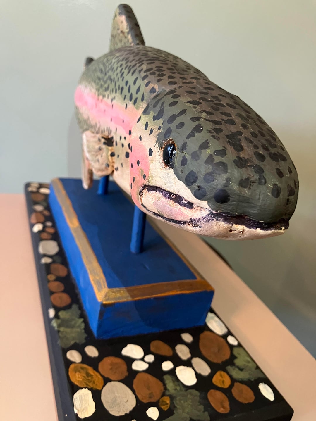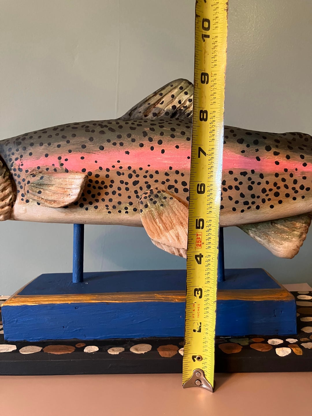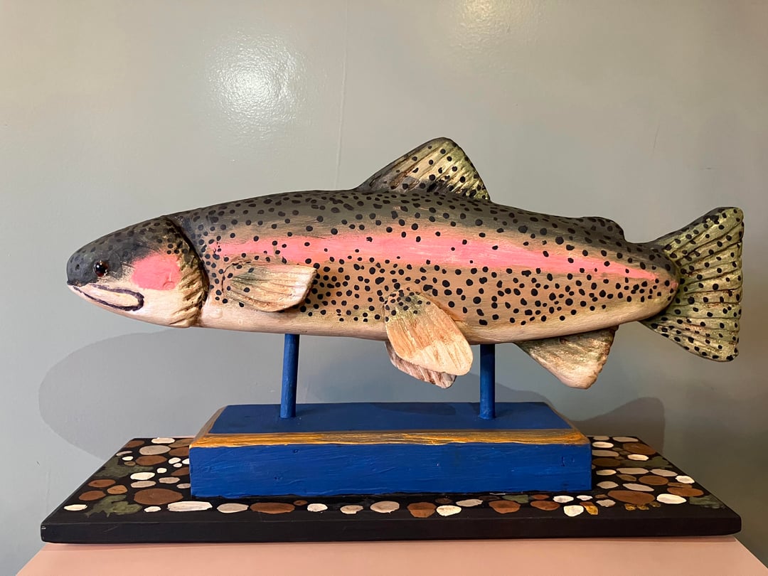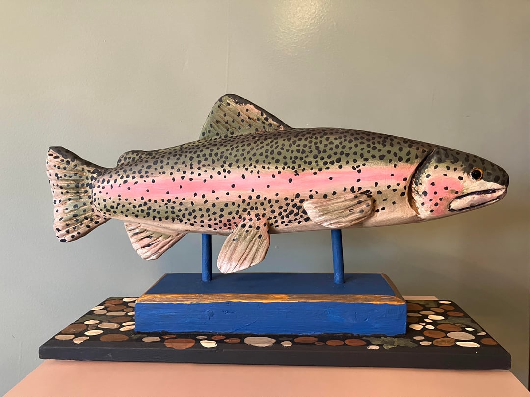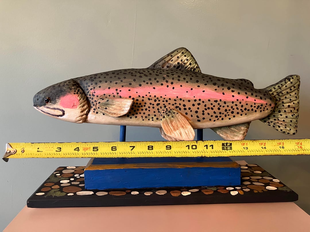 This Rainbow Trout Woodcarving is a unique piece of folk art and a real focus for your mantle or in the study. This sculpture measures 18" by 5.5" by 10" is hand carved & painted.