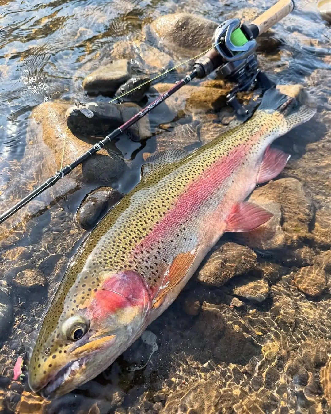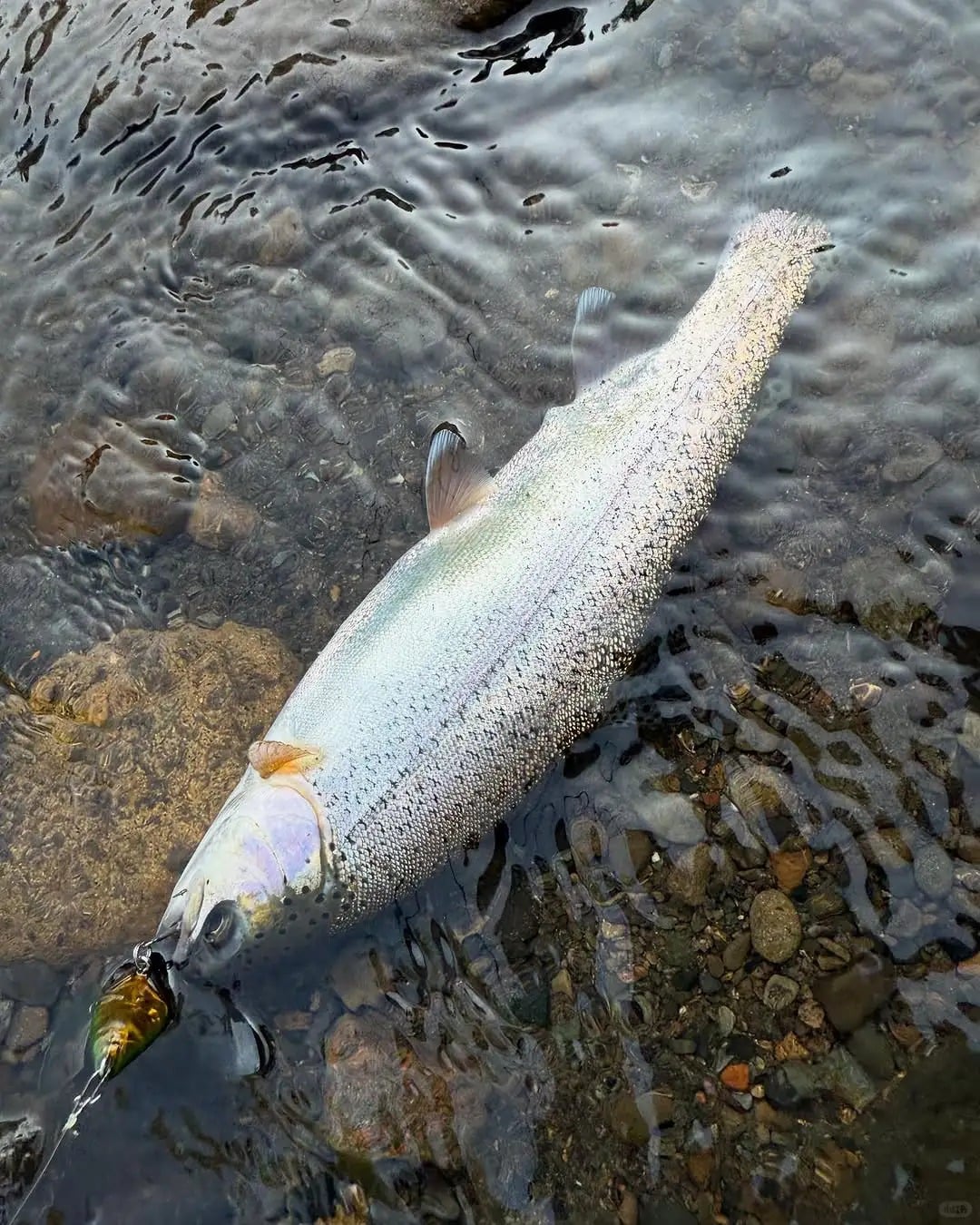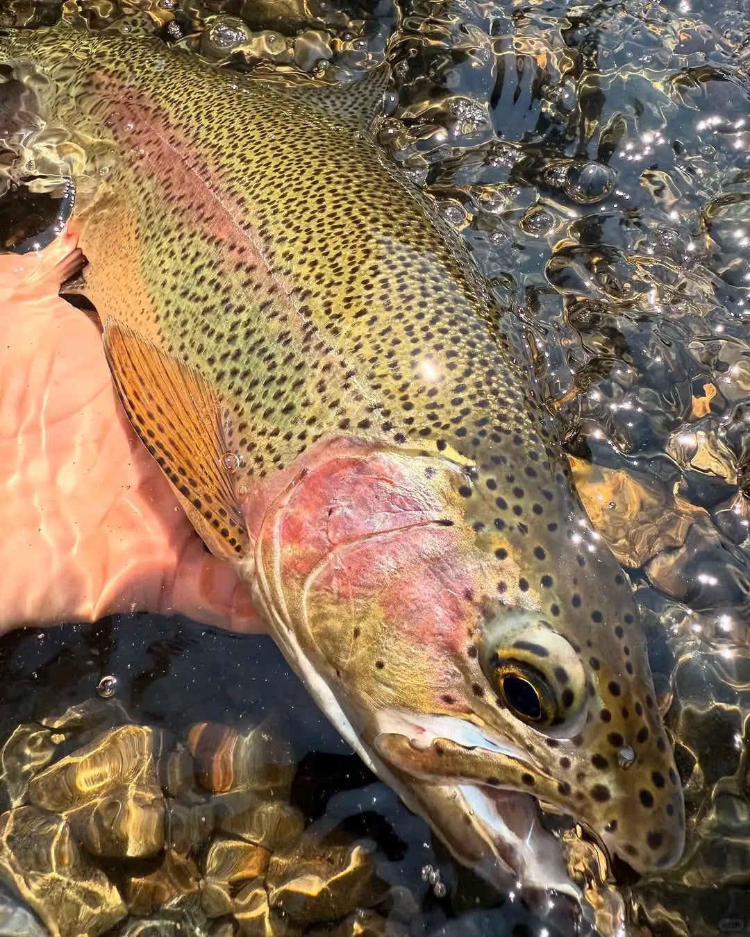 🐟: Don't wear bright colored jackets! Rainbow trout is timid, squatting on the rocky beach and throwing a rod