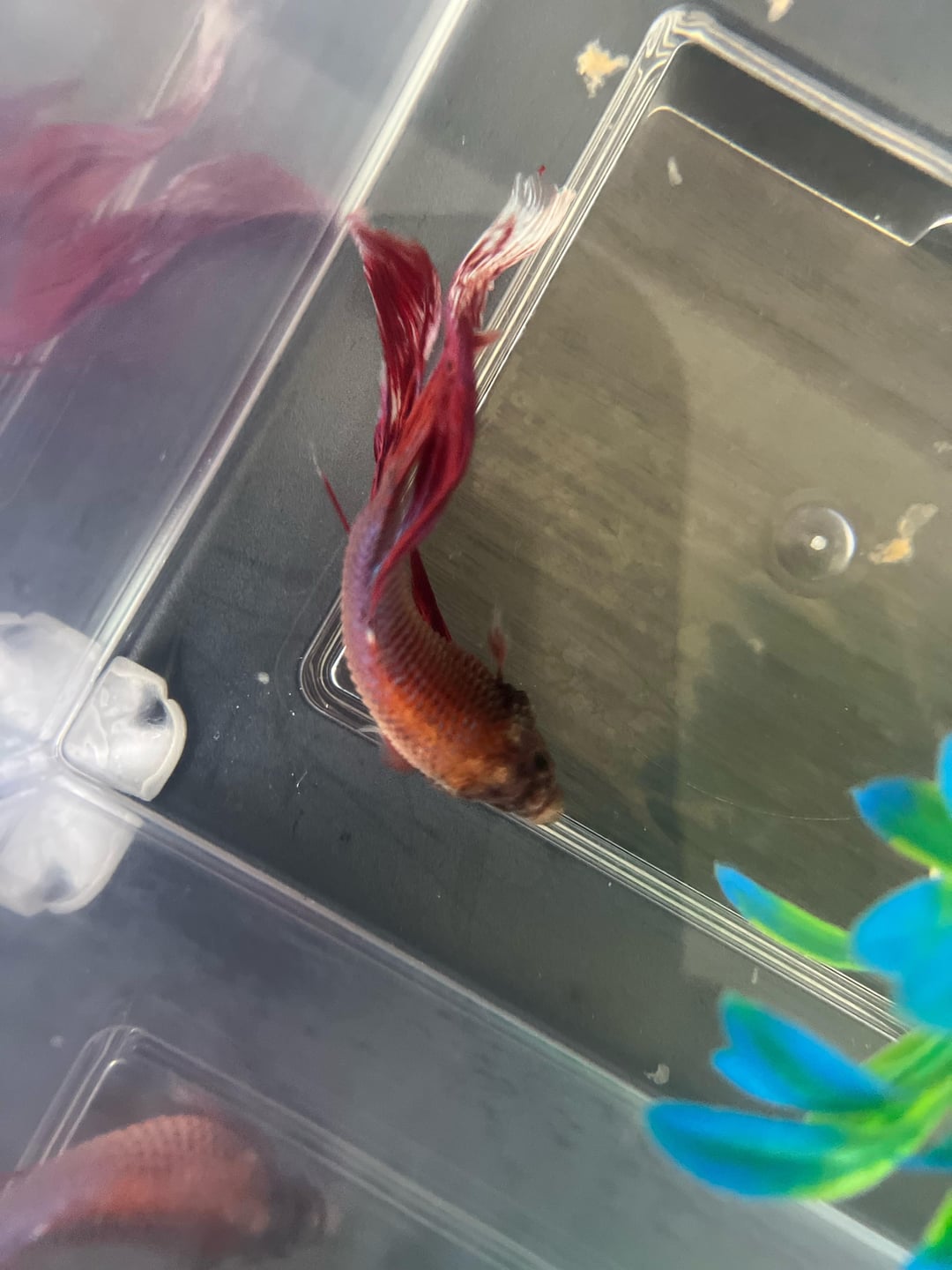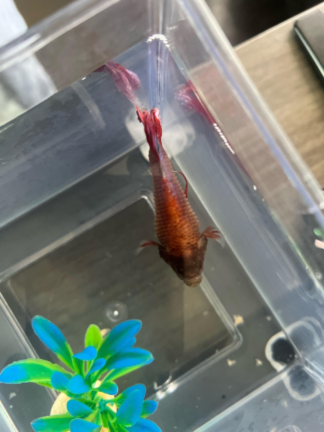 I only feed him 2 times a day 2 pellets in the day and 2 at night this is not his permanent tank this is just a tank so I can get a closer look at him and yes I will be changing his tank water this is not how he lives it’s just to closely monitor him is he okay and what can I do or give to help him I don’t want to loose him