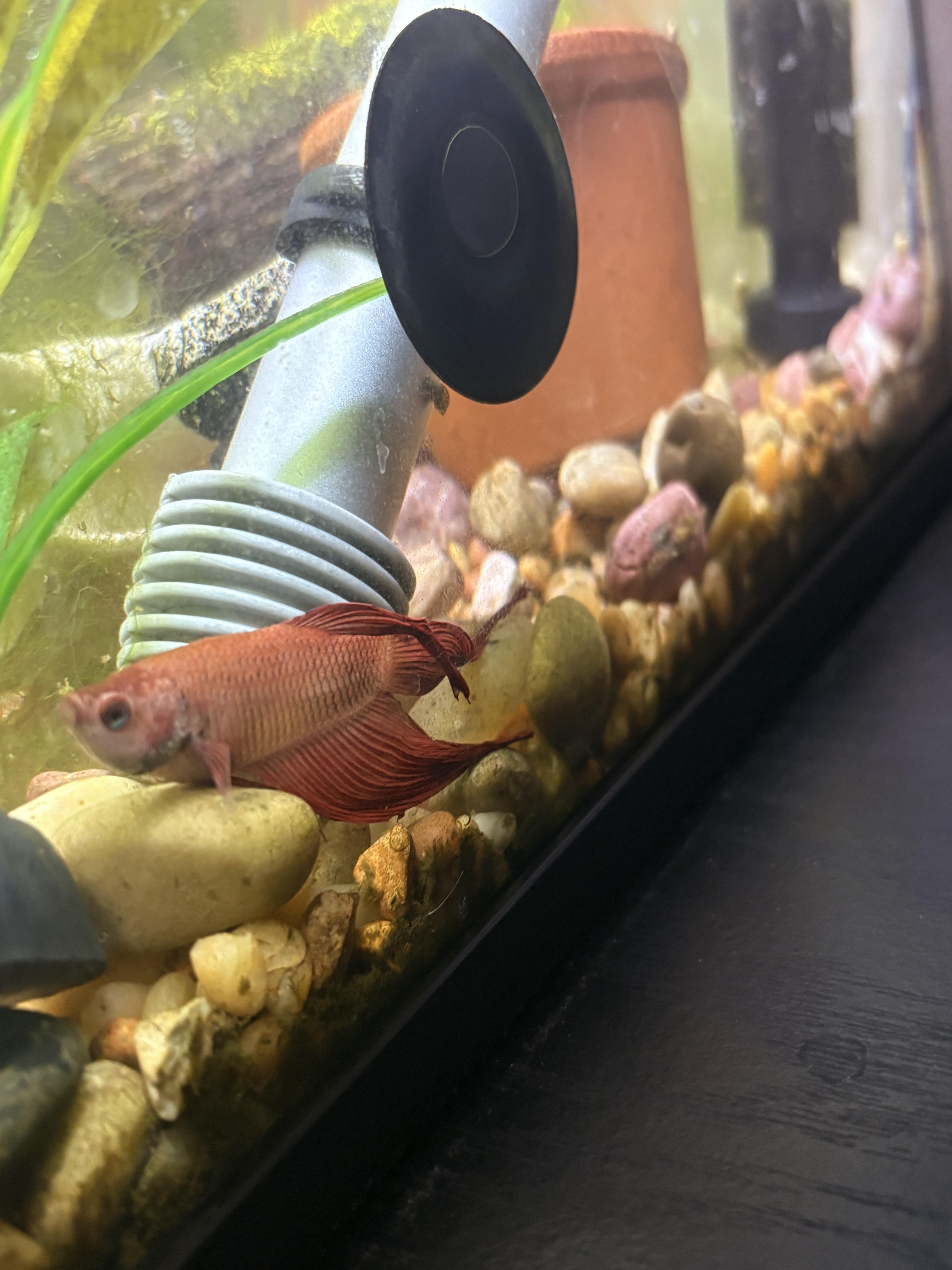 Hey! This is Clancy, he’s been with me a little over a year, he hasn’t gotten any bigger since I’ve gotten him so I’m pretty sure he was full grown when I got him, about 3 months ago he started getting the grey beard, and today I turned his light on and he’s super pale, usually he’s the same red as his fins (hes much paler than what the pictures picking up) he looks almost pink, he’s not swimming much which is super unlike him, I brought the water level down so that he has an easier time getting air, I also added some more plants closer to the surface for him, is there anything else I can do for him?