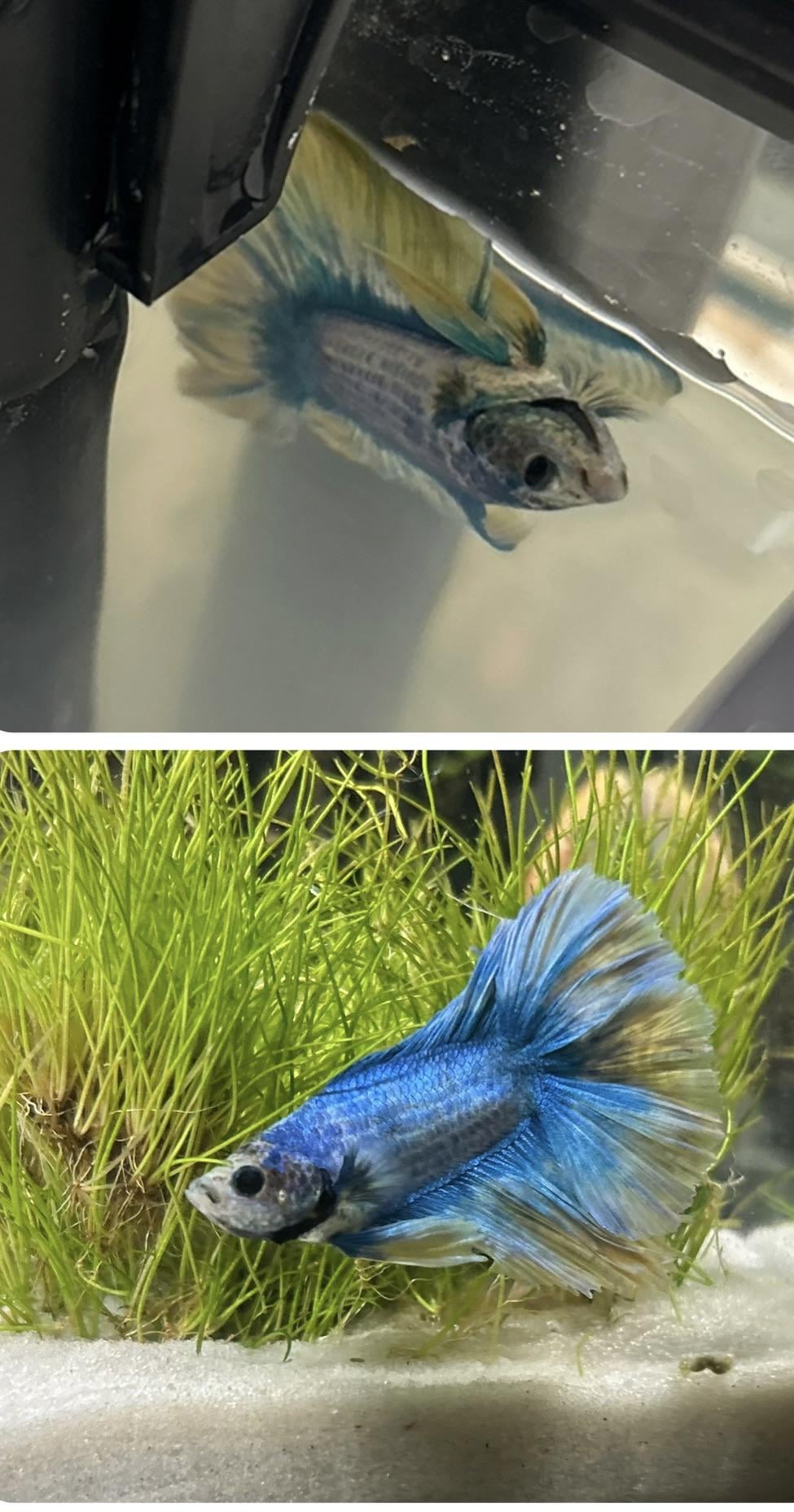 Betta Fish: Poor guy was literally stuck upside down two days ago when I walked by him. I didn’t think he would survive the transfer to my home and tank but he somehow did. 72 hours later he’s pulled through swimming again and starting to turn his beautiful blue.