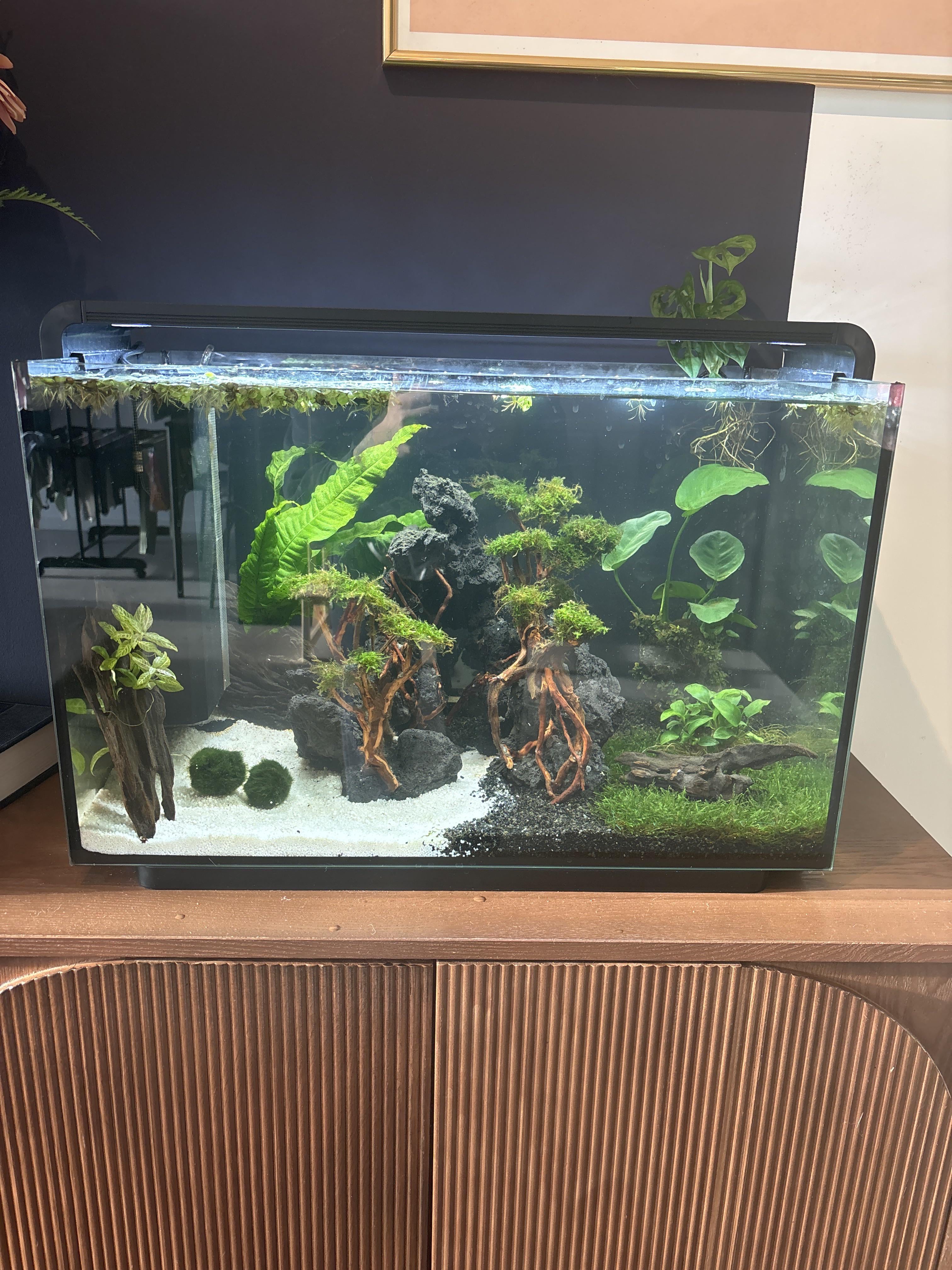 Then I accidentally dropped some Seachem Purigen beads into the tank (yeah, great moment 😅), had to siphon a bunch to get them out, and ended up doing a ~40% water change. That was actually my first water change since starting the cycle.