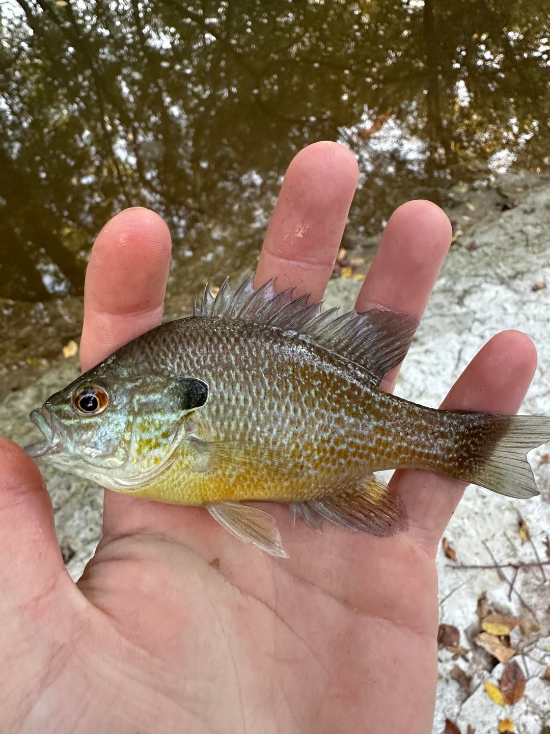 Green sunfish or some type of sunfish. Very fun to catch, Hella aggressive. Ive caught them on wacky rigs intended for bass. How they got that in their mouth is beyond me.
