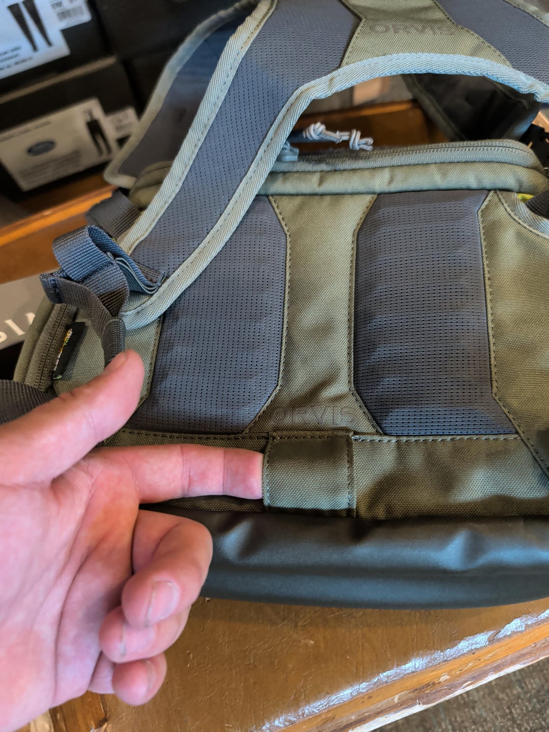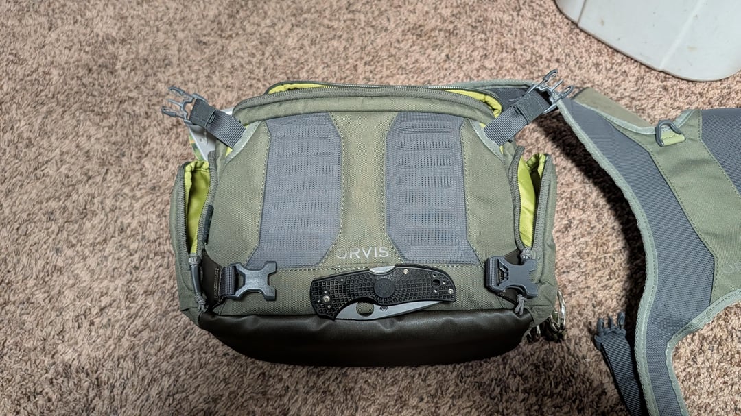 All the various sizes of Orvis chest packs have this loop on the bottom of the back side. It seems a bit wide for a zinger, their packs all have the tippet dock on the front, so no need for that.