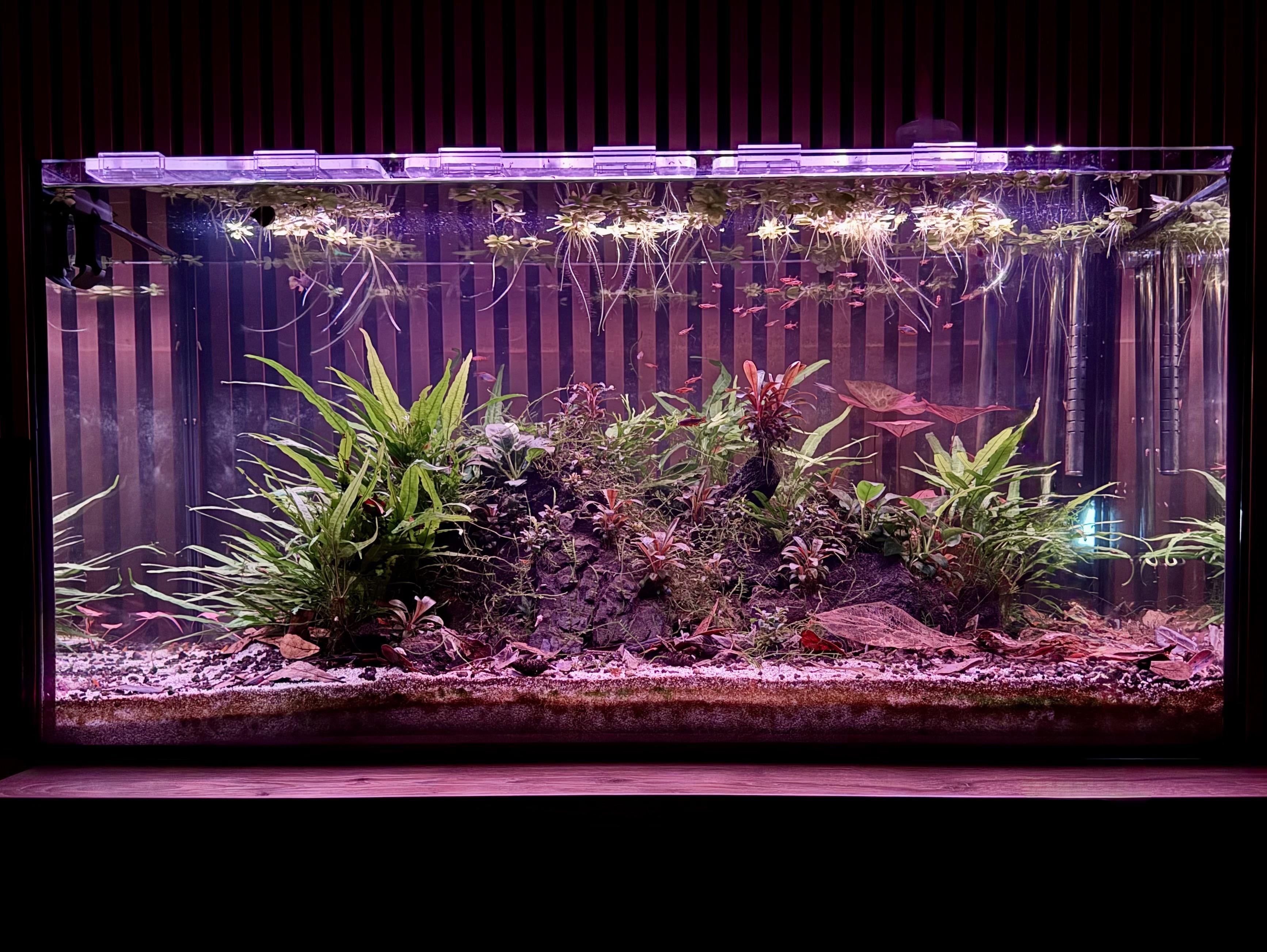 Tech: Oase BioMaster Thermo 250, hygger RGBYW 36 W (day–night cycle).