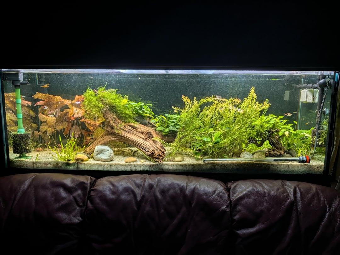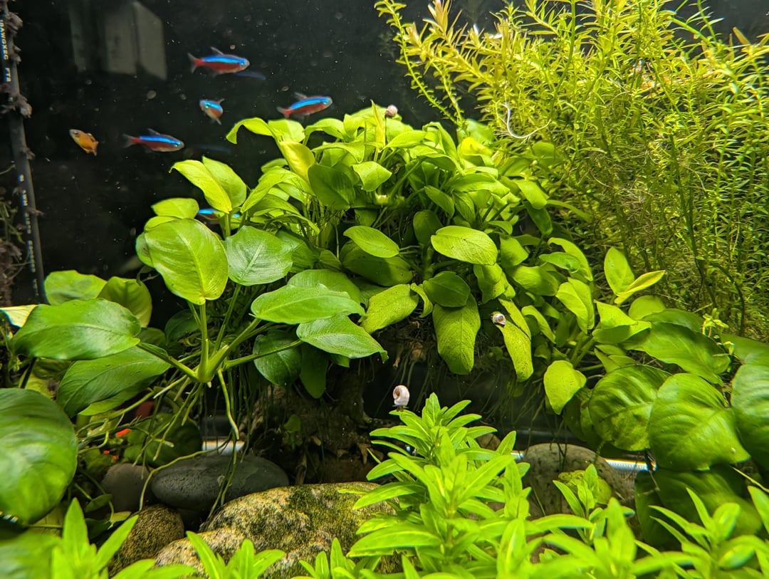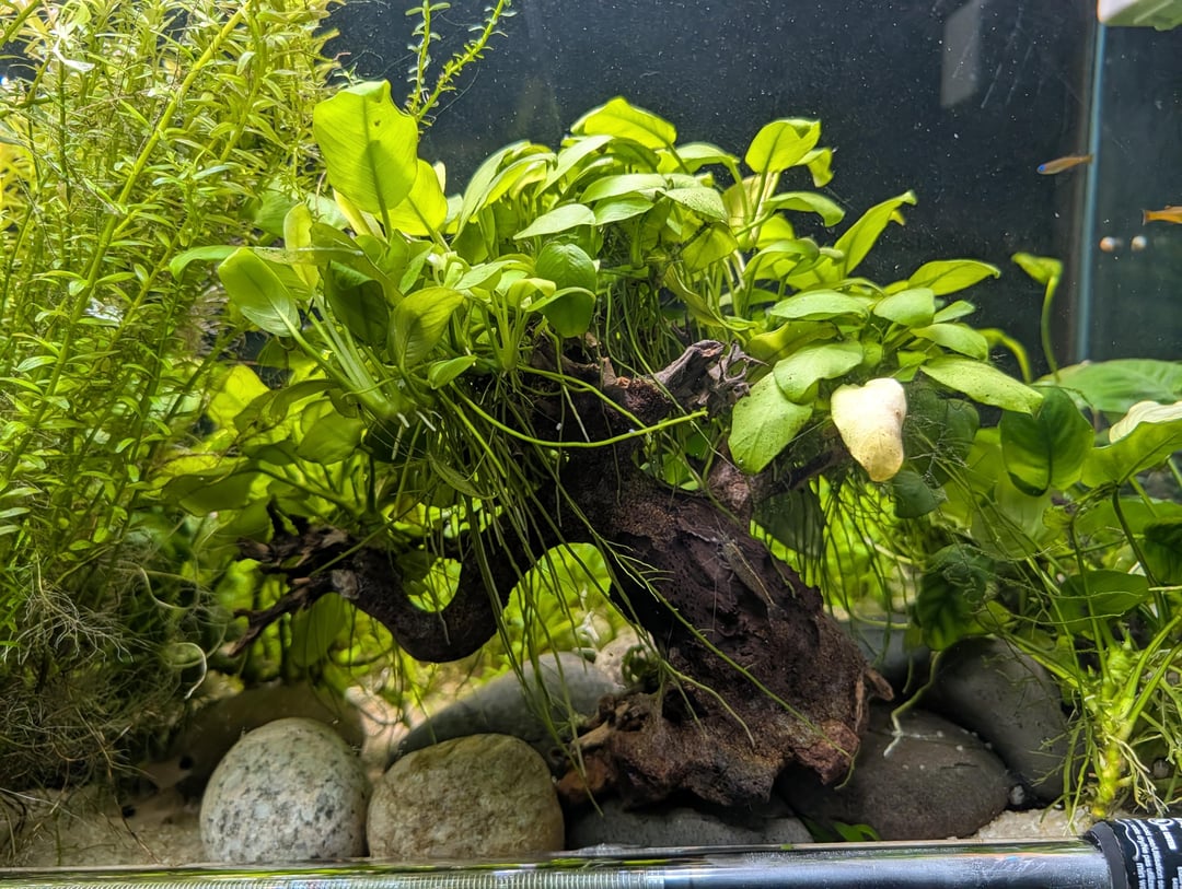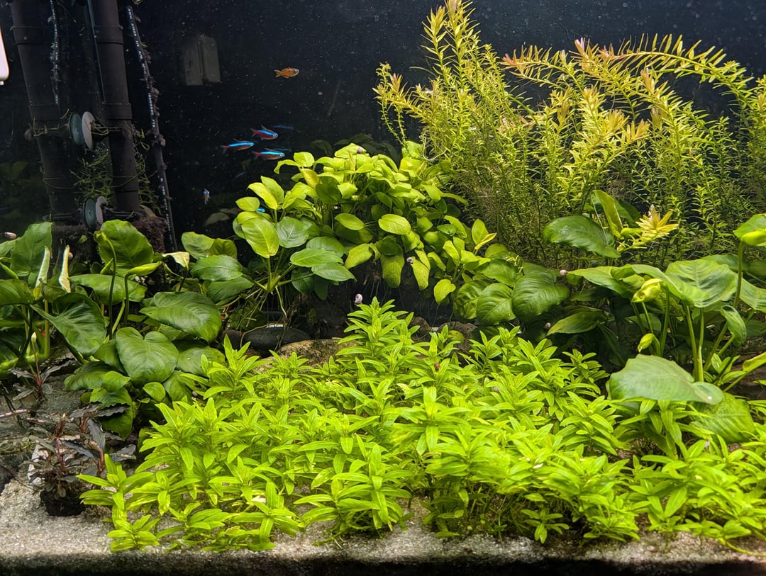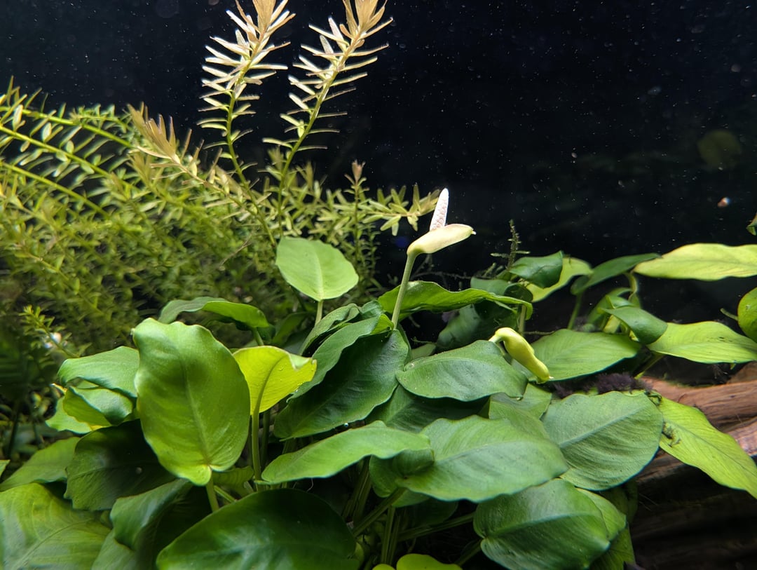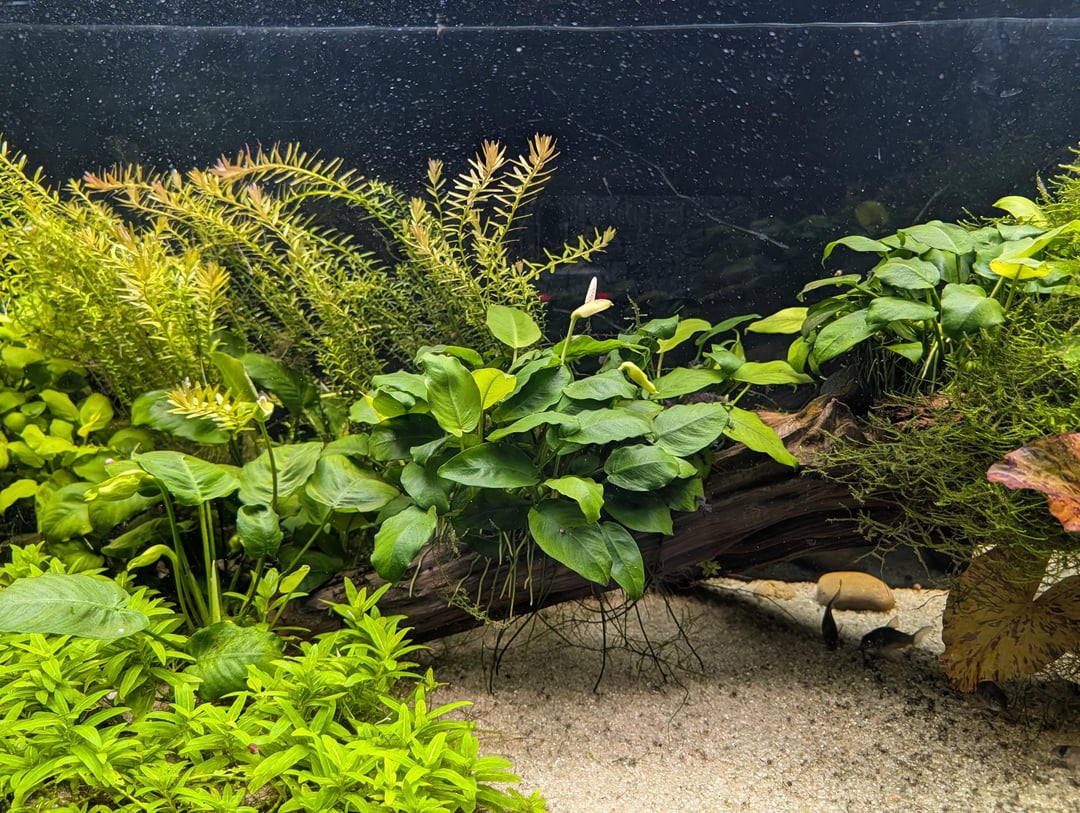 I did a 20 gal water change today and trimmed up some moss and stem plants. The s repens is surprisingly staying low and bushy for once. It kept growing and I had to trim it down before but maybe it knows now to just be short and bushy. Tossed in several root tabs for them so maybe we'll see them grow or propagate around the front. My anubias…es are going crazy right now with so many flowers popping up. Also included a back shot of the tank since why not. Hoping the corkscrew val grows in some more so I can replace the rotola indica or whatever that is in the back with it since it grows too well in my tank.