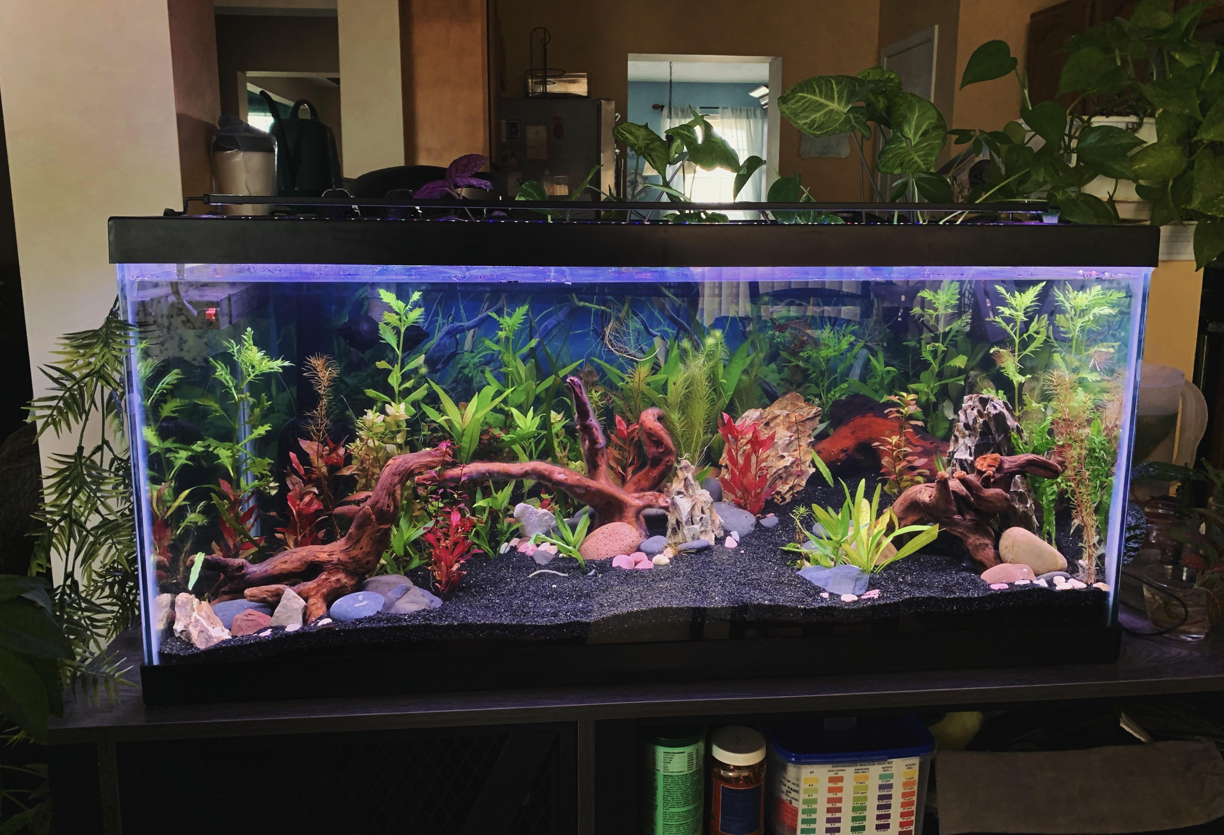 I turned my turtle’s tank into a planted tank as a way of honoring her. It’s 40 gallons, cycled, heated, and heavily planted. The filter is a Fluval FX2. Substrate is peat moss capped with blasting sand. The only critters in there are bladder and I think ramshorn snails that hitchhiked on the plants.