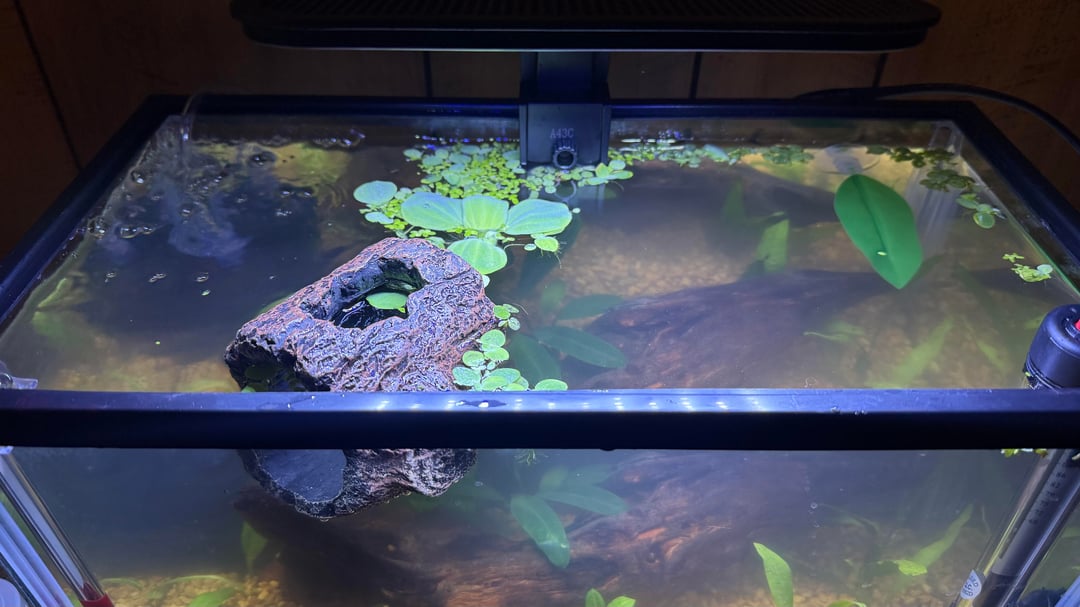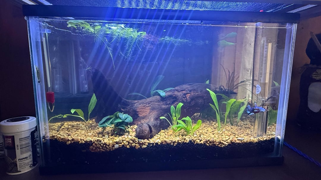 This is Aquarius and his Otocinclus buddies! They just got a whole rescape last night for the 5 gallon tank they’re in. There’s a good mix of plants between the floaters, anubias, rosette sword, java fern, and a couple others! I’ll be getting an air control valve to lessen the bubbles coming out of the sponge filter or putting an air stone inside it.