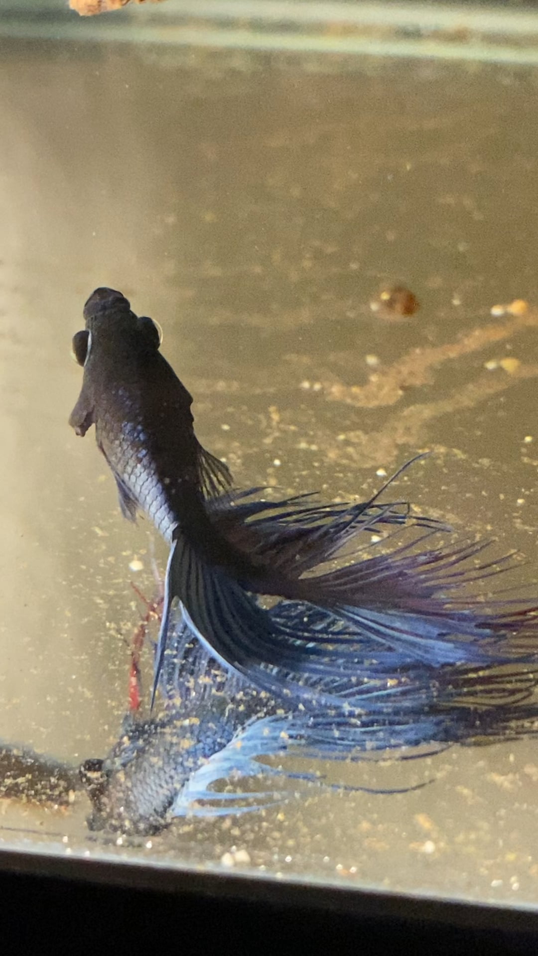 I was at pet smart today getting some prime for my other tanks and I saw this poor guy in a tiny little cup. He was barely moving and was gasping for air and I couldn’t help but try to save him. I had a spare 10 gal and a bubbler that has already been cycled in another tank so I quickly set it all up with a heater and acclimated him into it. He has been moving a bit but there’s a lot of things going on I’m worried about. He is breathing very fast, one of his gills seems a bit swollen (probably ammonia burn) and he mainly lays on the floor (like in the picture). Whenever he swims up to the surface tk breathe he does super erratically and often spins around a couple times while trying to get up. He has been pecking at some left over food on the bottom of the tank which is a good sign. I’m really hoping to save him as he has a beautiful dark blue color and red accents that would look so good when his color comes all the way through. If anyone has some advice and what else I can do please let me know! I plan on getting some almond leaves in there tomororw and will hopefully get some substrate and plants in it on Wednesday (when I get paid lol). I know this was super impulsive but he just looked so sad 😭.
