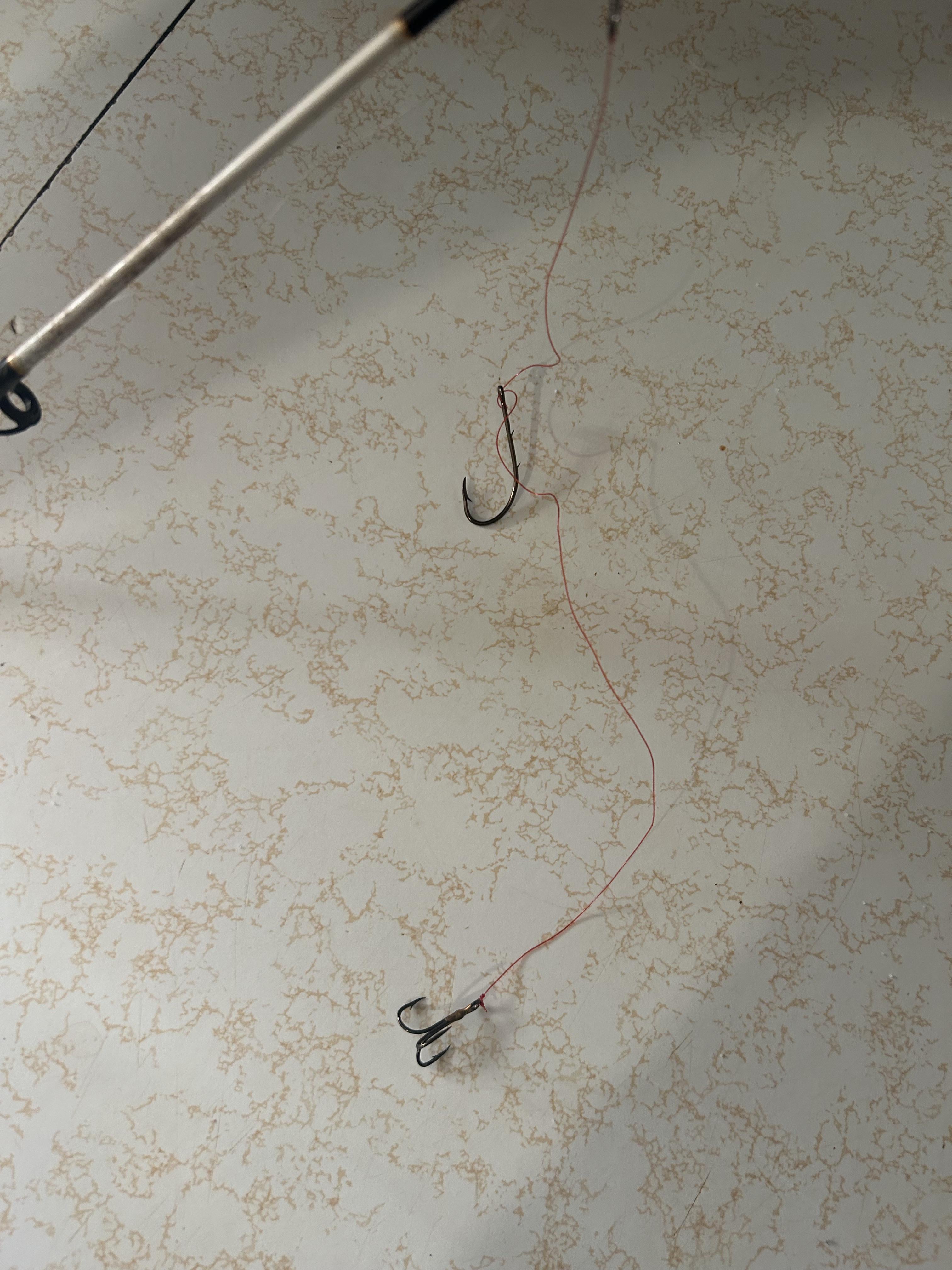 I rigged up these 2 hooks the triple hook at the bottom and the normal one top, the top hook is knotted in a way where it won't come off if a fish tries pulling on it but it has enough slack to move freely, ideally towards the triple hook at the bottom.