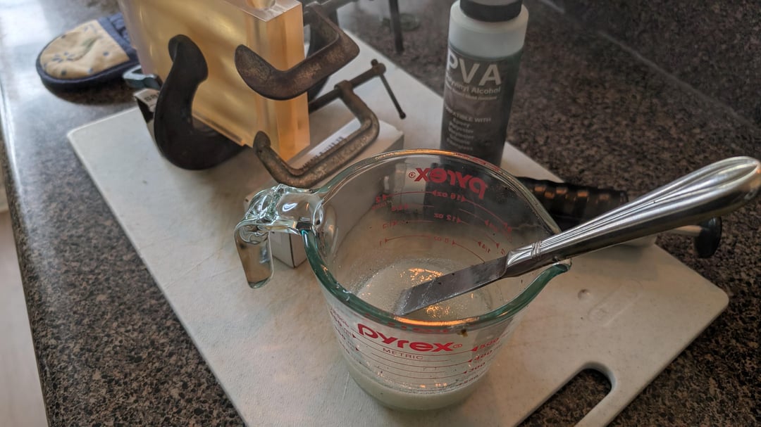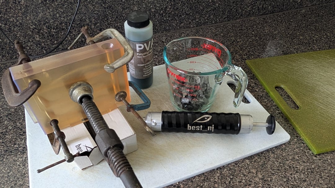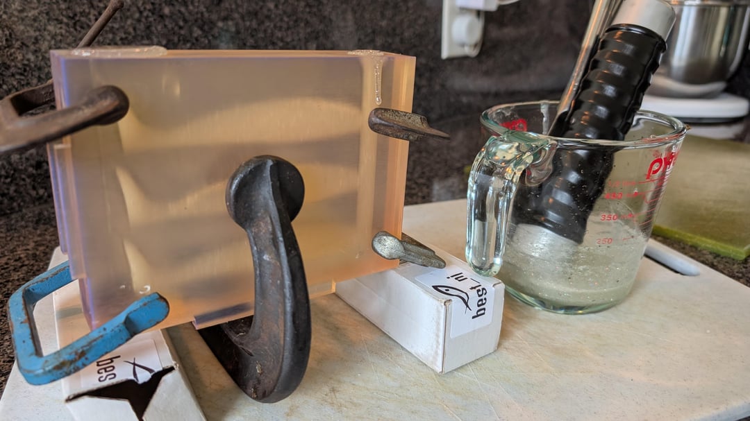 I chose the Formlabs High Temp resin, which had a HDT (heat deflection temperature) of 238 degrees C, about 60 degrees above the melting point of the plastisol I would be injecting into the mold with. I ordered an injector from Amazon, which was made special for making fishing jigs. I also purchased a bag of soft-plastic worms (ordering a gallon of plastisol cost upwards of $100 and I wasn’t sure if the mold would work yet. I melted the worms after cutting them up into ¼” chunks in the microwave I kept in the garage, and loaded the injector to capacity. I pre-warmed the mold in an oven to 30 degrees C which would help the injected plastic from flash-cooling and flow freely to the bottom. I designed the mold with an overflow vent, which would fill only after the air and subsequent resin from the cavities were filled.