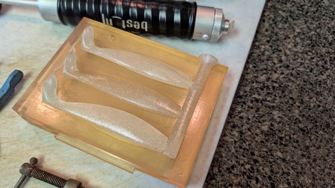 I let the mold cool for a half an hour before undoing the clamps. I had three great soft plastic lures and sent a photo to my friend who started asking questions about how much each mold cost (about $100 instead of $5,000.) He determined he could make four sets of each design and rotate them – filling one and allowing it to cool as he ejected the fourth one. He could charge anywhere from $10 to $20 per packaged set and have bags made and branded to the shop. He knew that certain colors and mixes of glitter worked best certain times of the year and was pretty excited that it wouldn’t be as hard as he thought to tool up.