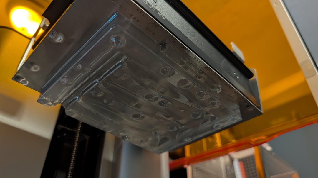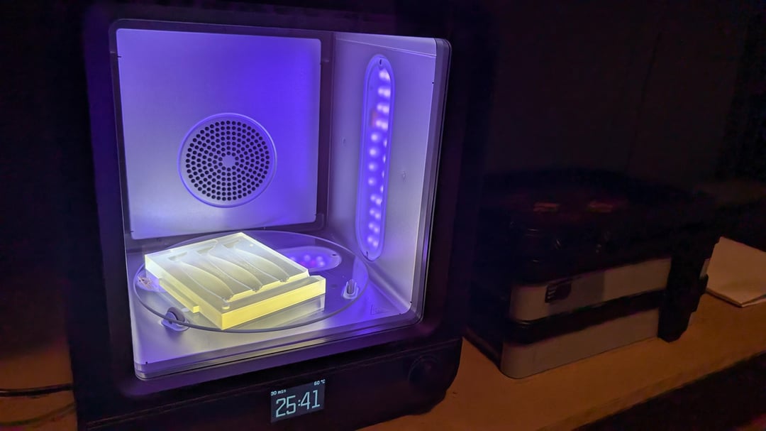 I told him about the high temperature resin projects I had gotten involved with, and had seen what other fisherman were able to do on their own. I asked him for a design he wanted to test and sculpted it inside of Meshmixer. Once I had a good form, I imported it into Fusion 360 – made three copies and subtracted the three forms from a mold block with registration detents I could use to hold the mold parts together. I would use c-clamps to hold the halves of the mold together. I maxed out the build plate capacity of the Formlabs Form 4. I had seen other companies use the Form 4 to make molds for short run injection molding and felt pretty comfortable I’d be able to do it with the low pressure injector.