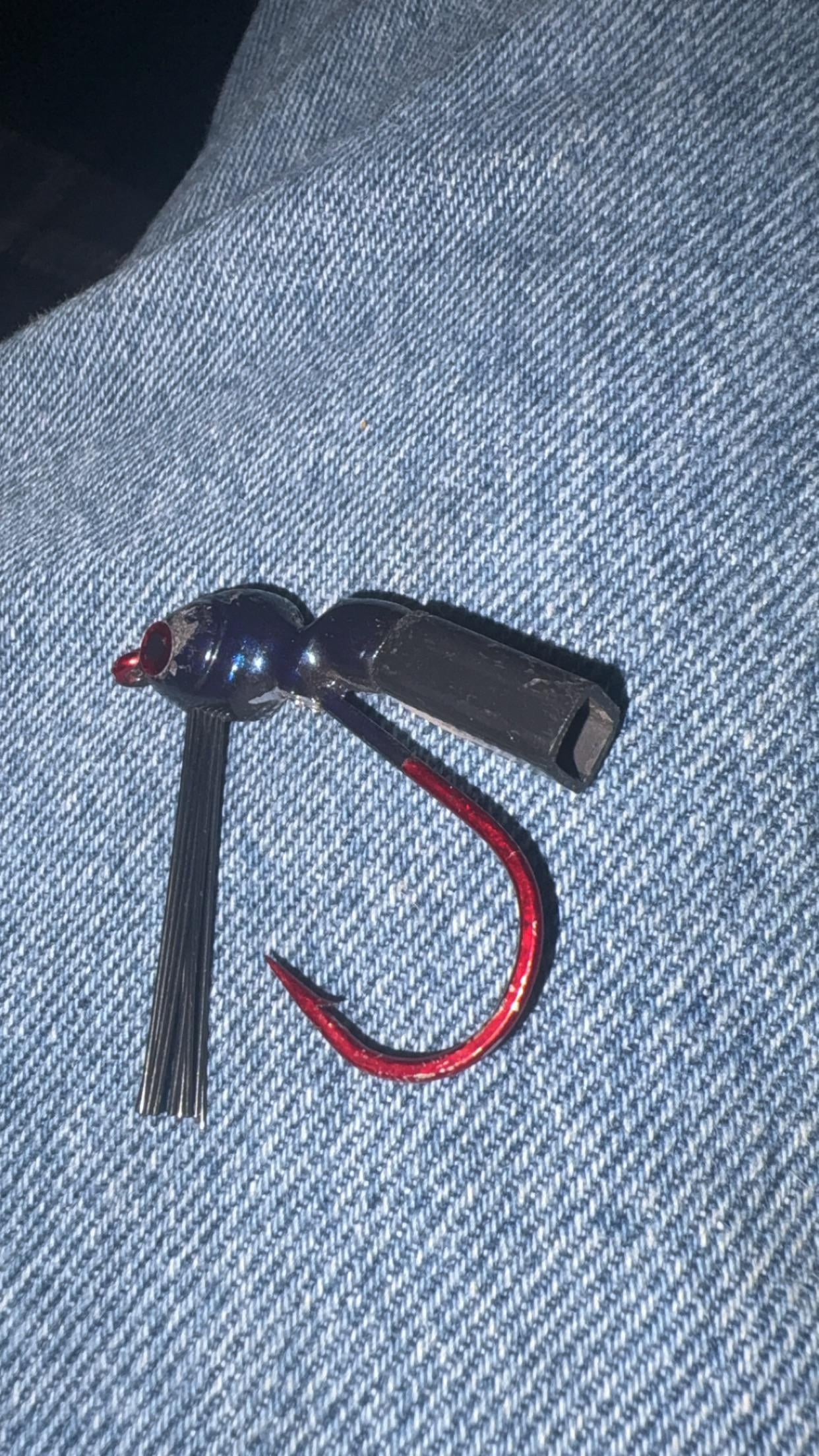 It looks like a swim jig. The plastic rectangle is a rattle. It looks like the end cap fell off and it lost it’s ability to rattle