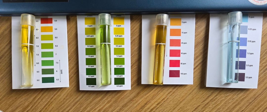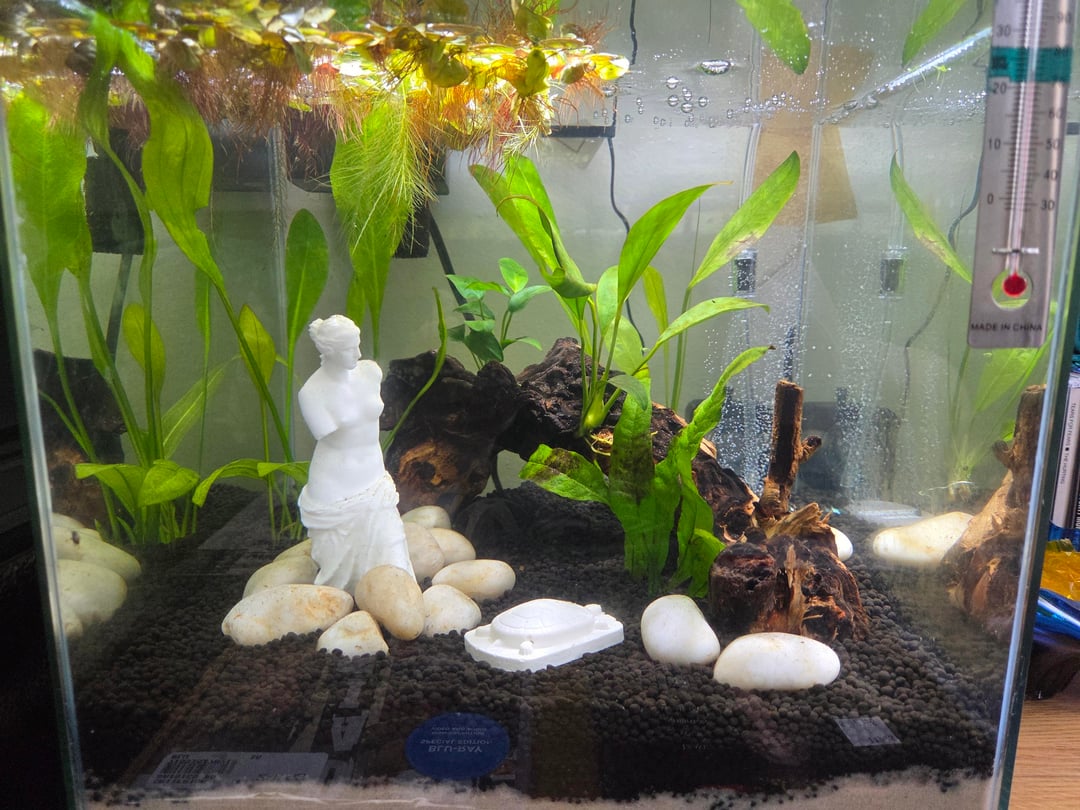 This is a 6 gallon cube tank, I plan on getting 1 mystery snail and some shrimps for it. It's been cycling for 3 wks (4 wks on Friday). Currently the only thing besides the plants is some bladder snails who hitched a ride, which im leaving alone for now since im not providing them with food except for whatever algae and biofilm is in there. Friendly advice appreciated! Parameters are on the last photo.