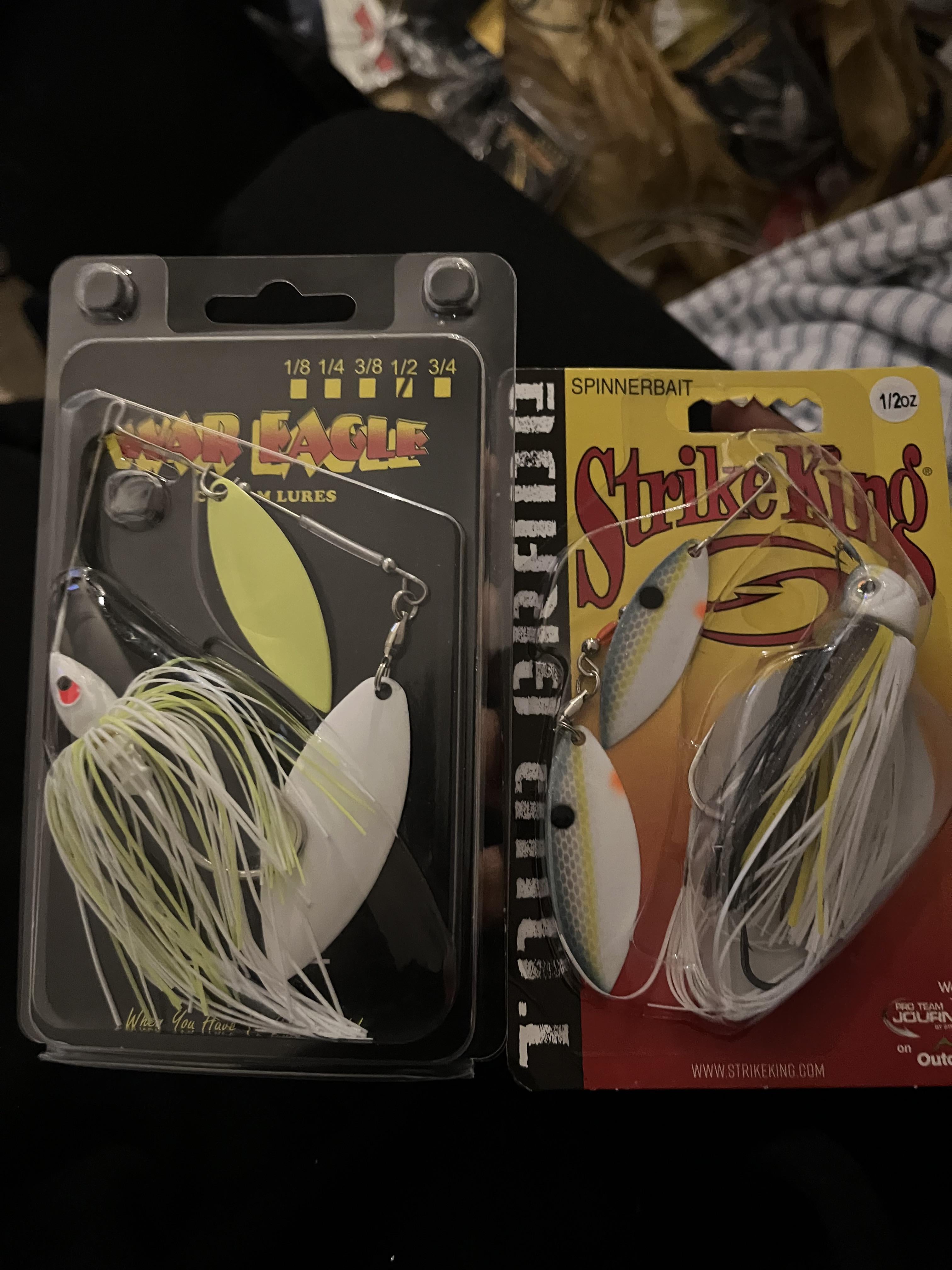2. Ive caught tons of fish on both. The war eagle is better for burning and generally covering water. They start up easier and are great in current and overall. That said, the tour grade strike kings have that big, full, “perfect skirt” and have caught me 5 fish over 8lbs. I like to slow roll them in cooler water. That skirt really is amazing. There used to be a version of that exact spinnerbait sold at Dick’s Sporting Goods with a white skirt and red strands along the belly that absolutely murdered big fish. The tour grade is better worked slow versus the war Eagle.