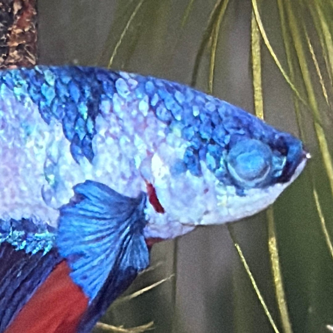 Labeled “tangerine koi male” on his cup. 🙄 I’m assuming he’s actually a dragon scale, given the apparent scale growing over his right eye and possible tumor on his side. Thoughts? Diamond eye?