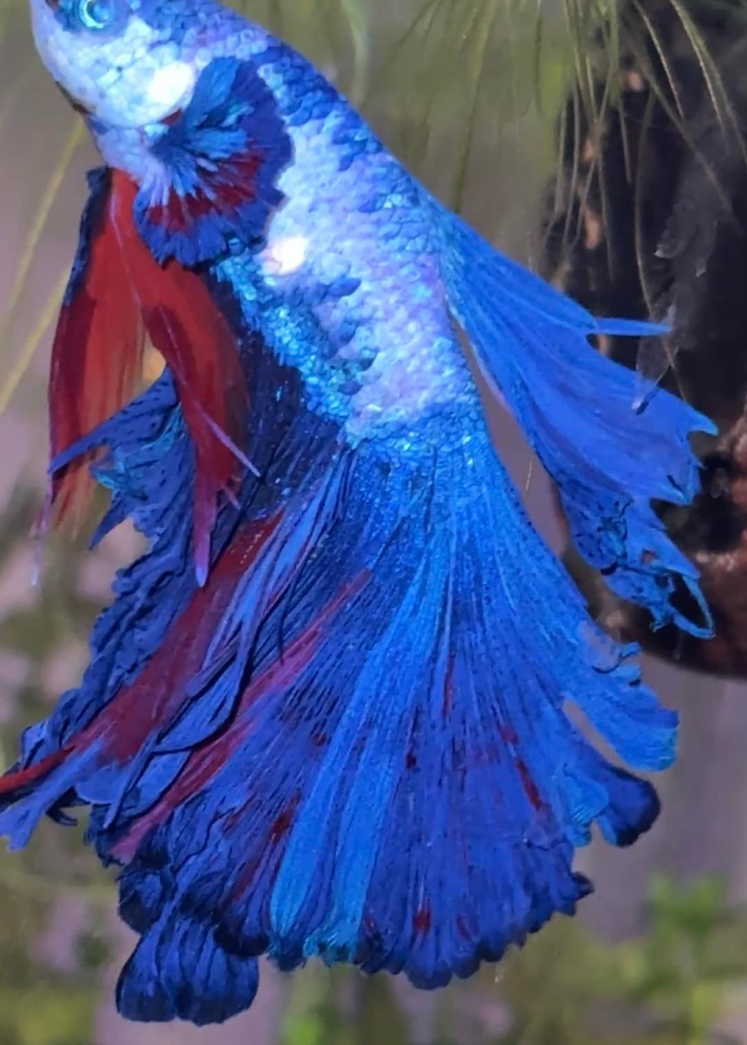 Brought home 7/4 of this year. Fish-in cycle. Planted tank, 10 gallons. Tankmates include 3 Amano shrimp, five Pygmy corydora catfish, and one mystery snail. Spiderwood driftwood, one rock structure, one floating betta log, sponge filter, and heater set to 78°F.