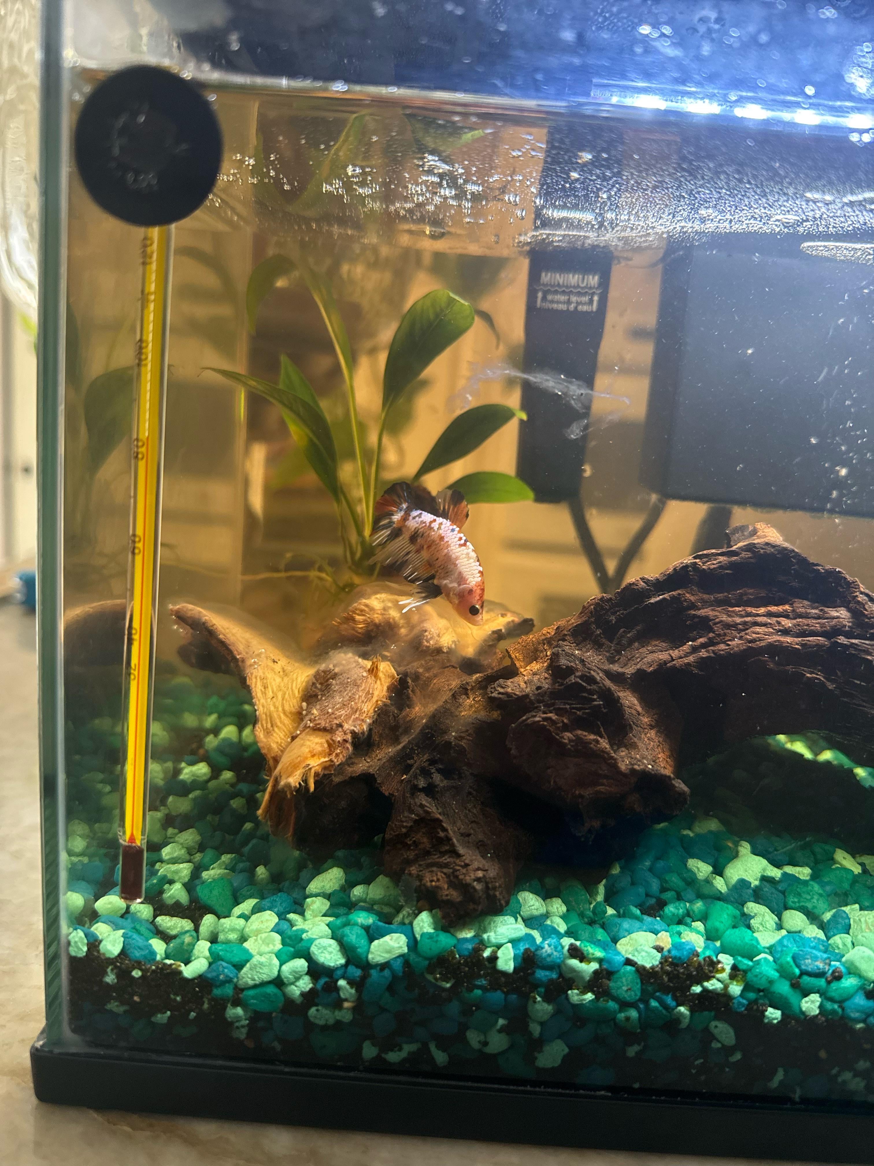 Silky looking foggy stuff hovering over the lighter part on the top of the Mopani wood. Some of it got broken off by Cowboy and you can see it floating over the Anubias plant.