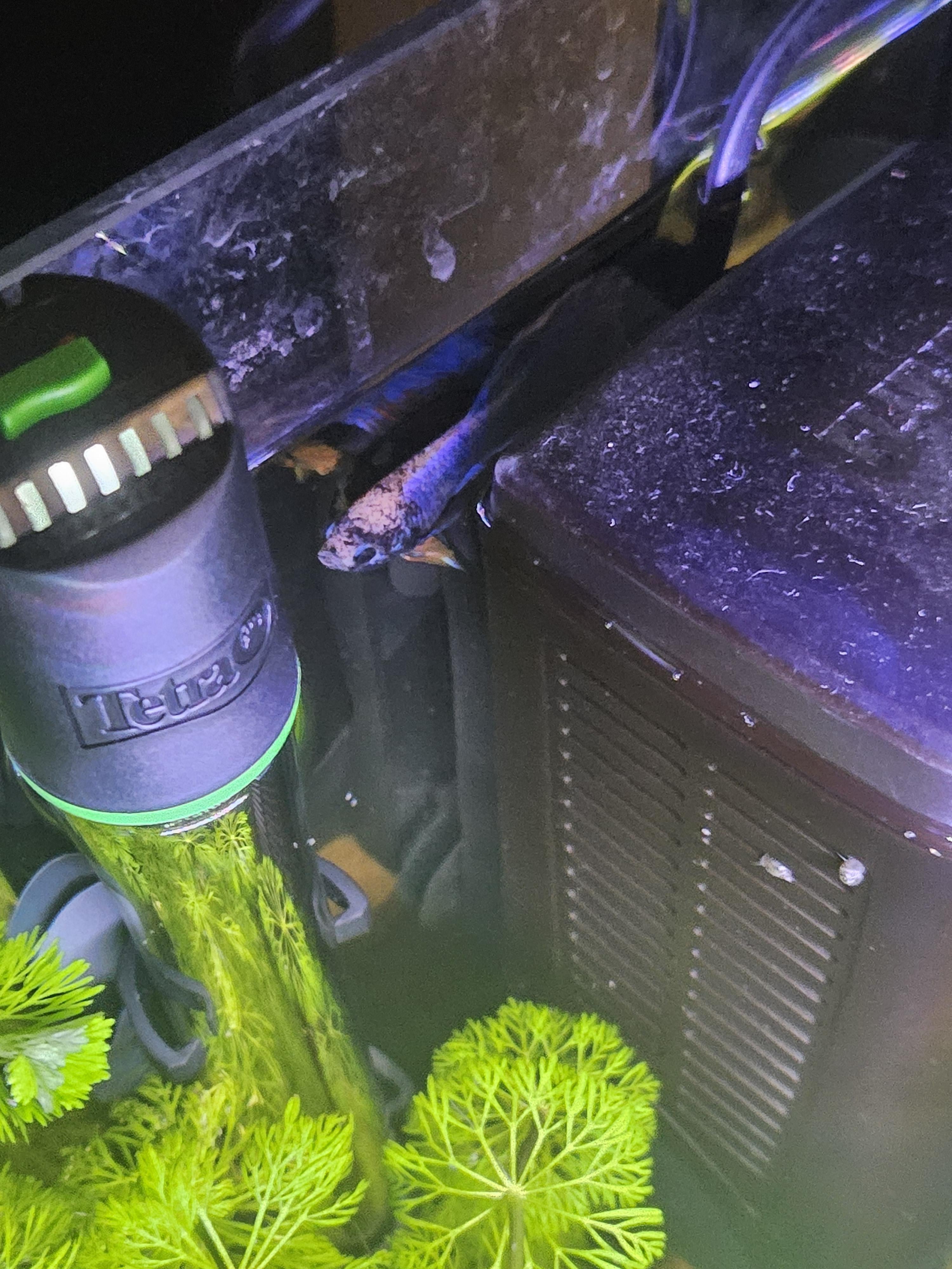 Whenever I can't find him, he's probably chilling behind the filter. Dude got a whole ass jungle to swim through and rather spends his time behind a hunk of plastic. Don't get me wrong he loves exploring the tank but I find it so funny that this seems to be his favorite spot. Absolutly love the little dude, love how his fins are growing and how his colours changed since I added him to the tank
