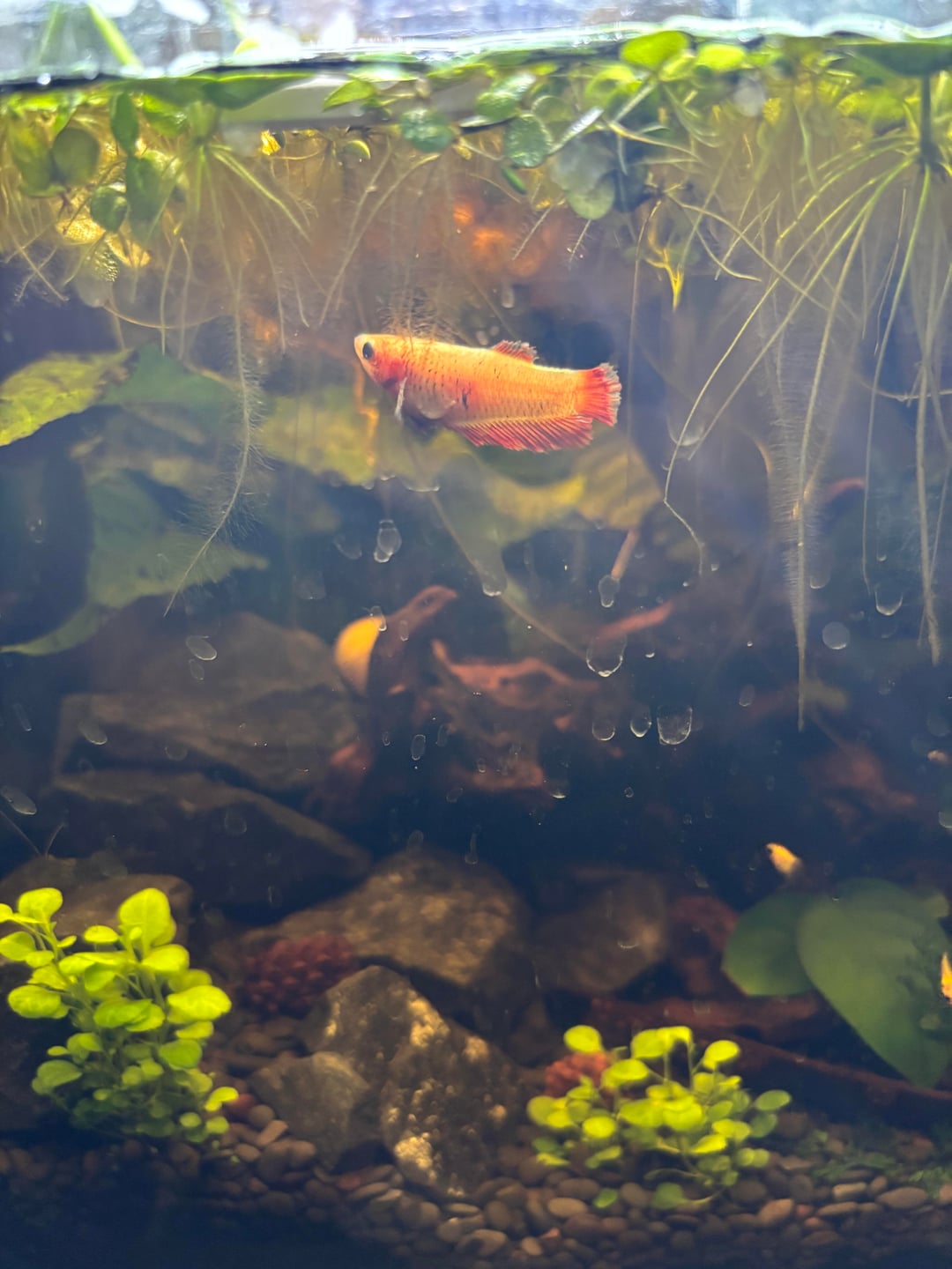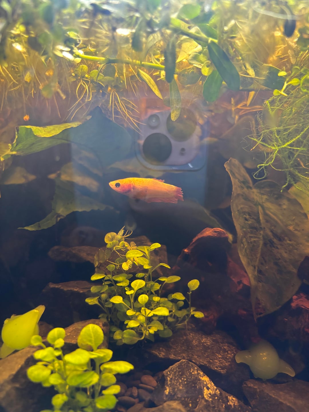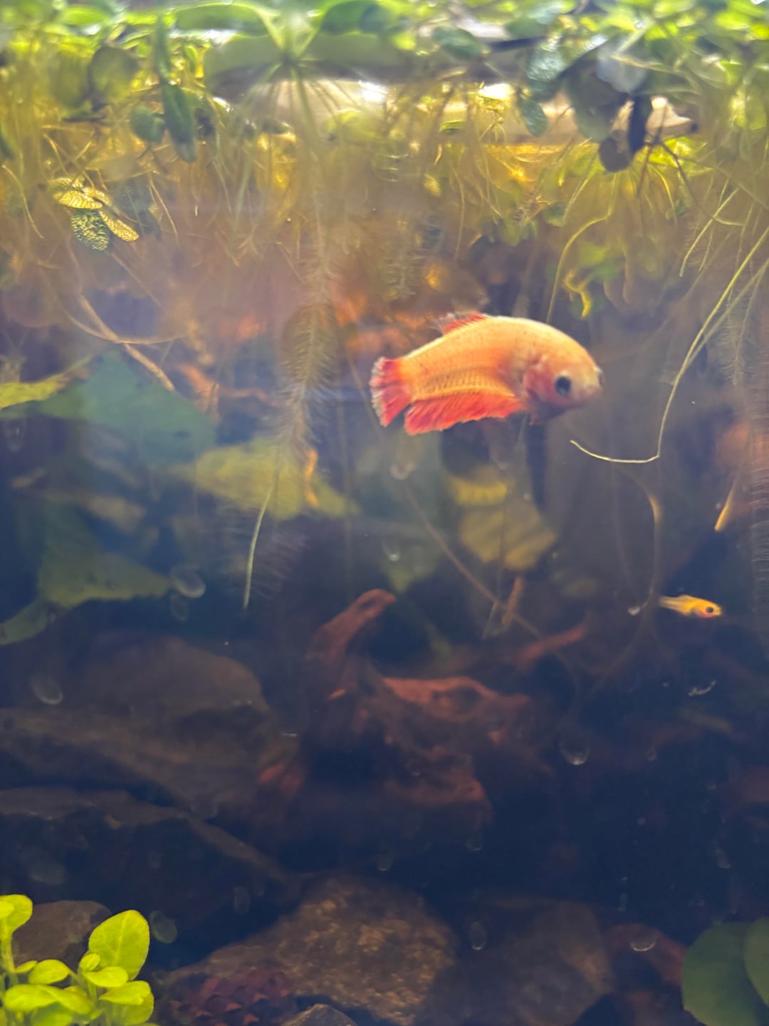 I got this little betta at a petco because the condition she was in, she was healthy just.. finless. Shes been treated with medicine to help with any fin damage and my hard work is starting to pay off ! I don’t know if her color will change much, but she does have quite a few flecks of blue now which i hope is a good sign.