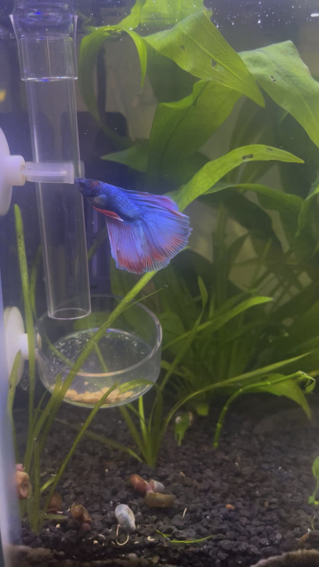 ~ little backstory: he seemed really feisty in the cup when i got him so i was a little worried for the rasboras, but all that attitude disappeared when i put him in the tank. i saw that he clearly had a swim bladder issue, turned the heat up a bit and fasted him for 3 days, he improved each day. he hid a lot in the beginning but he’s showing himself more now. he seems curious about his tankmates but he’s really mellow and chill, hasn’t gone after them at all. it’s only been a few days so we’ll see how he turns out 🙂