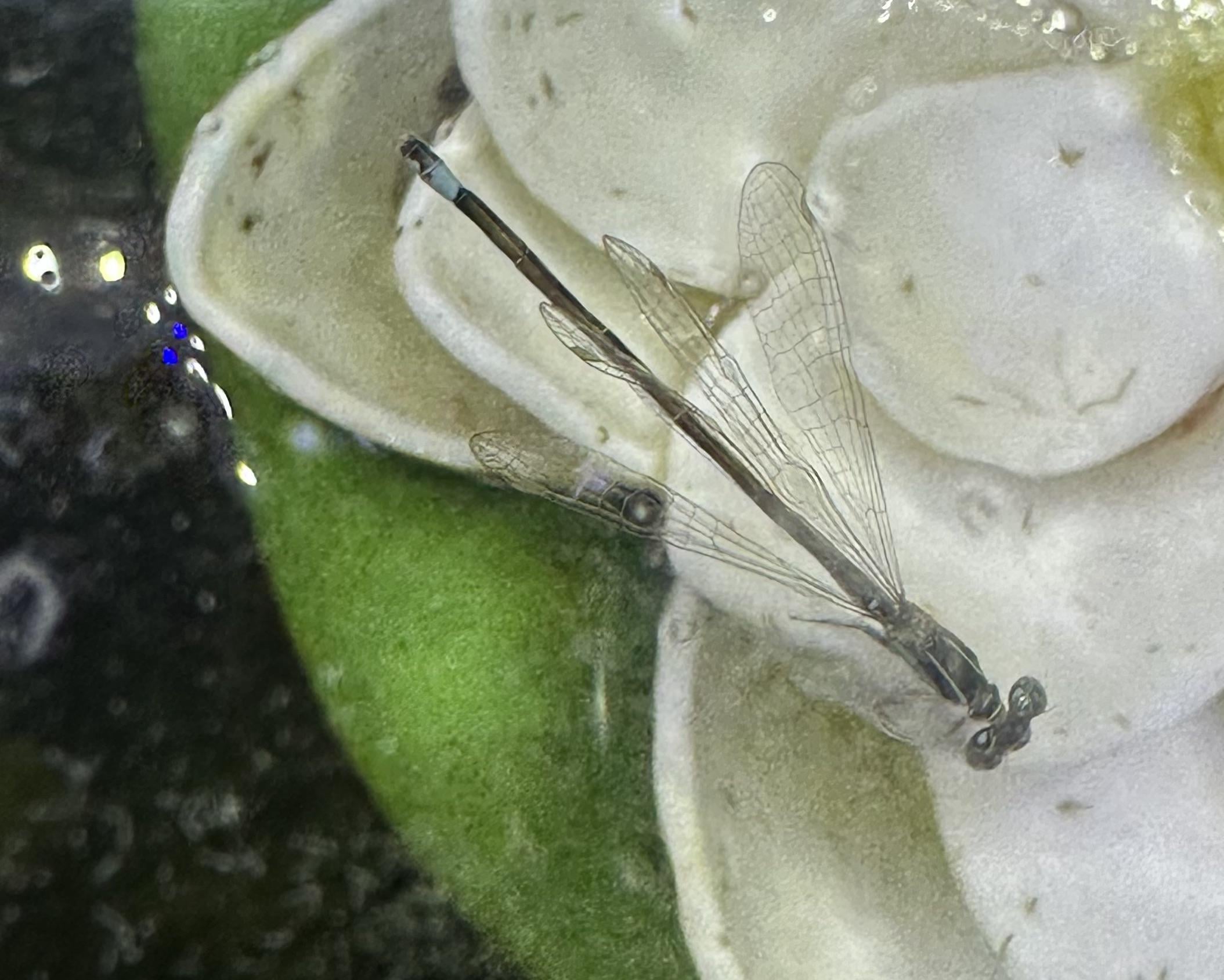 I was about to do some plant work and then saw this little guy hanging out on my floating decoration. I have red floaters and massive Lily pads from my banana plant, but luckily for me the damselfly liked my fake floating plant. I threw it away and removed the damselfly.