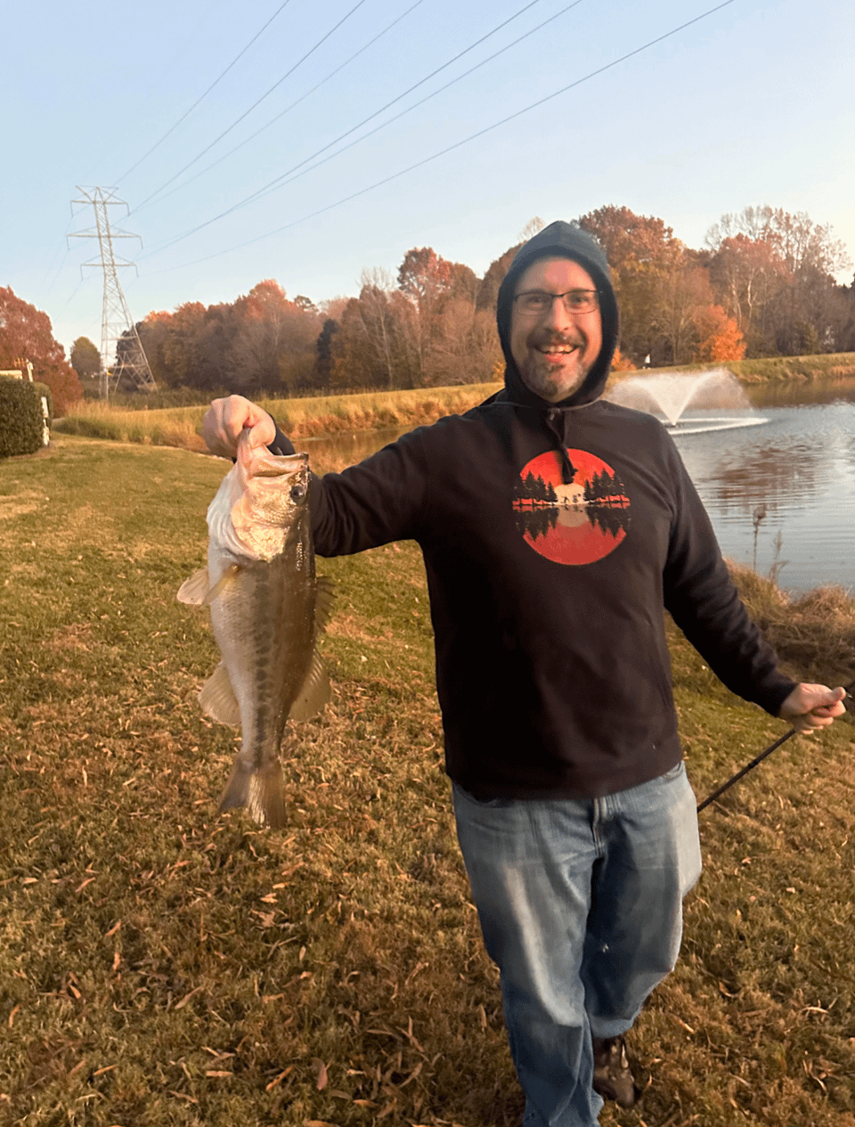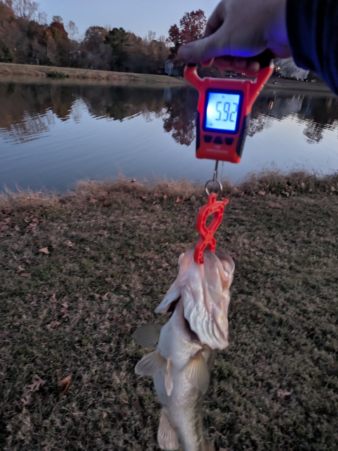 Charlotte NC, Caught at dusk on a almost dead stick Texas rigged Green Pumpkin senko. Dropped it into the deepest part of a wind blown bank with all the warmer water from the last beams of low sun.