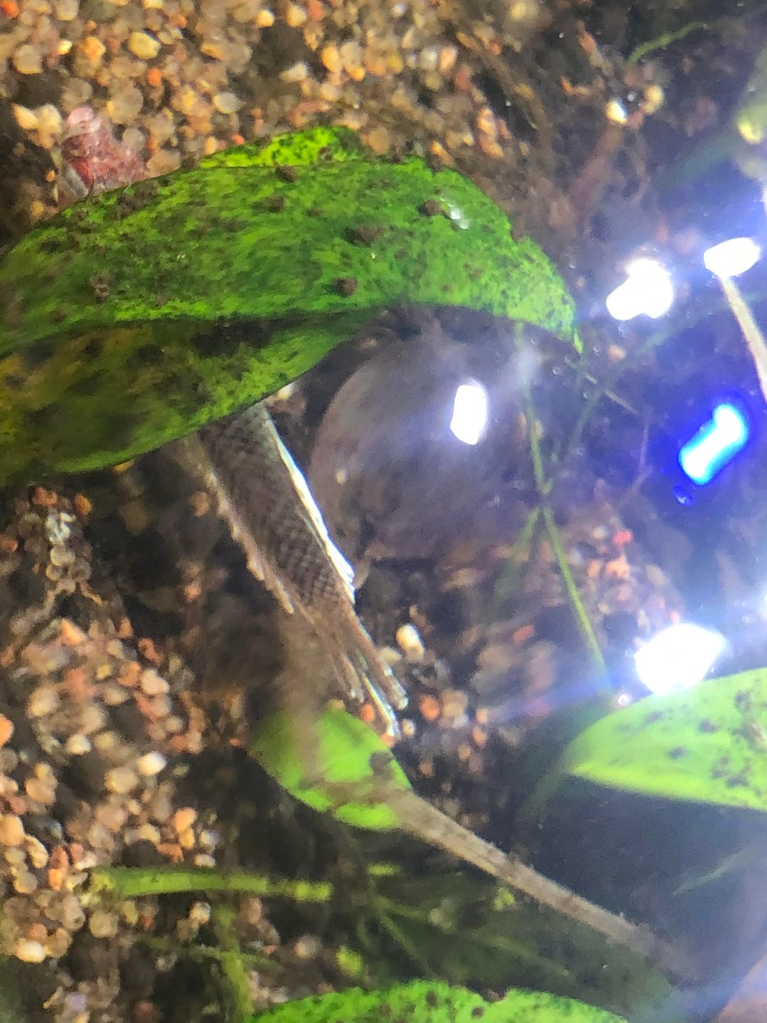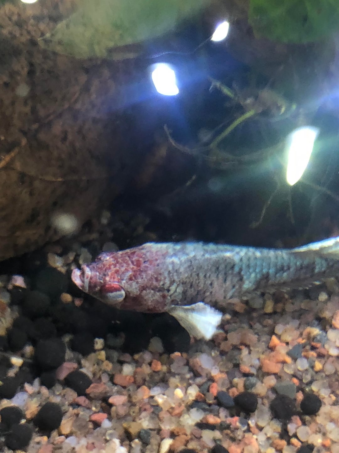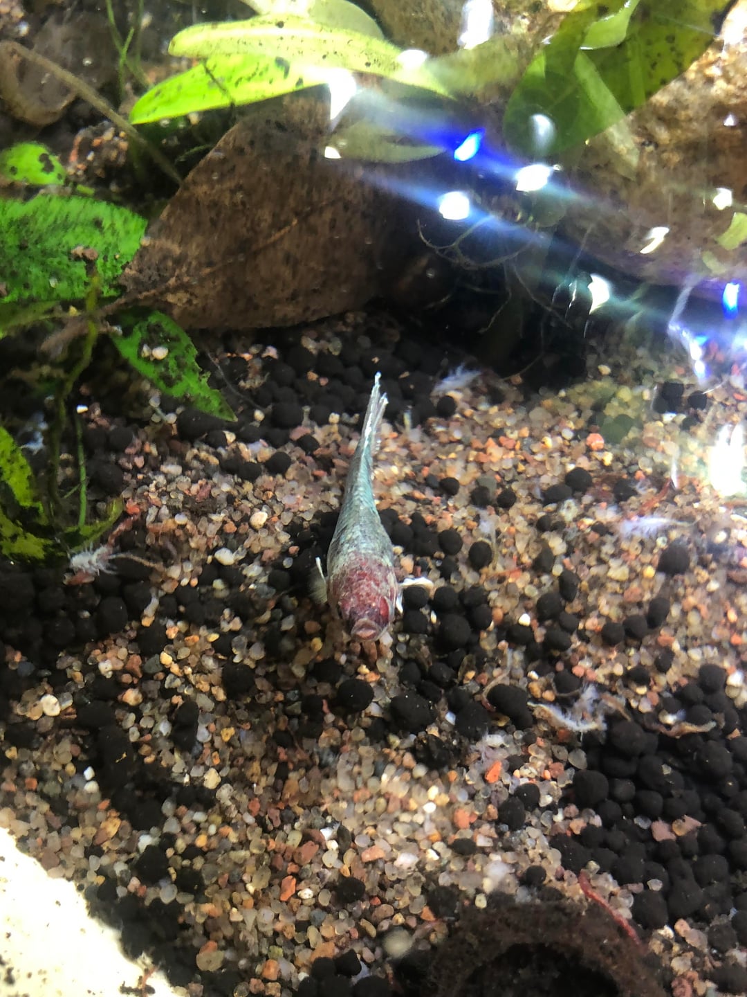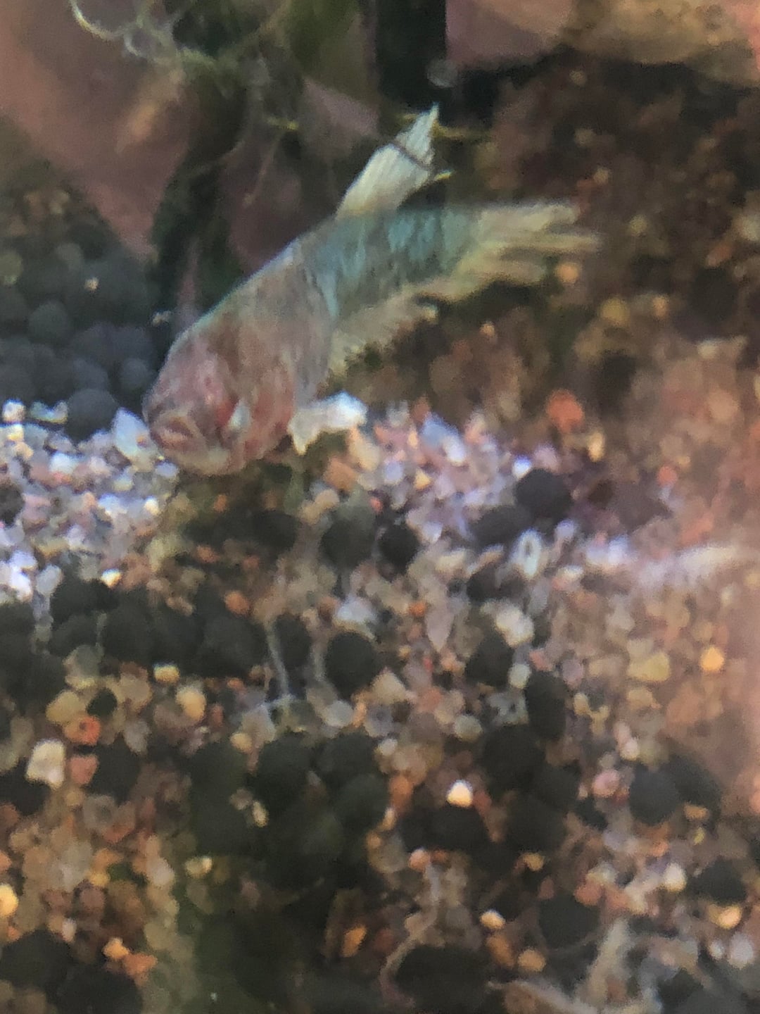 So, now I have her all by herself in a plant pot originally set up for shrimp breeding! The pot itself is a little over 5 gallons with shallow points in the front, which seems to be her go to hangout spot, and a nice little dip in the back with plants to hide in or lay on, a small heater and some bubbles to play in! Once she’s feeling better and back to health I’ll be moving her into my, very peaceful, 48 gallon community tank where she’ll live the rest of her life in luxury!