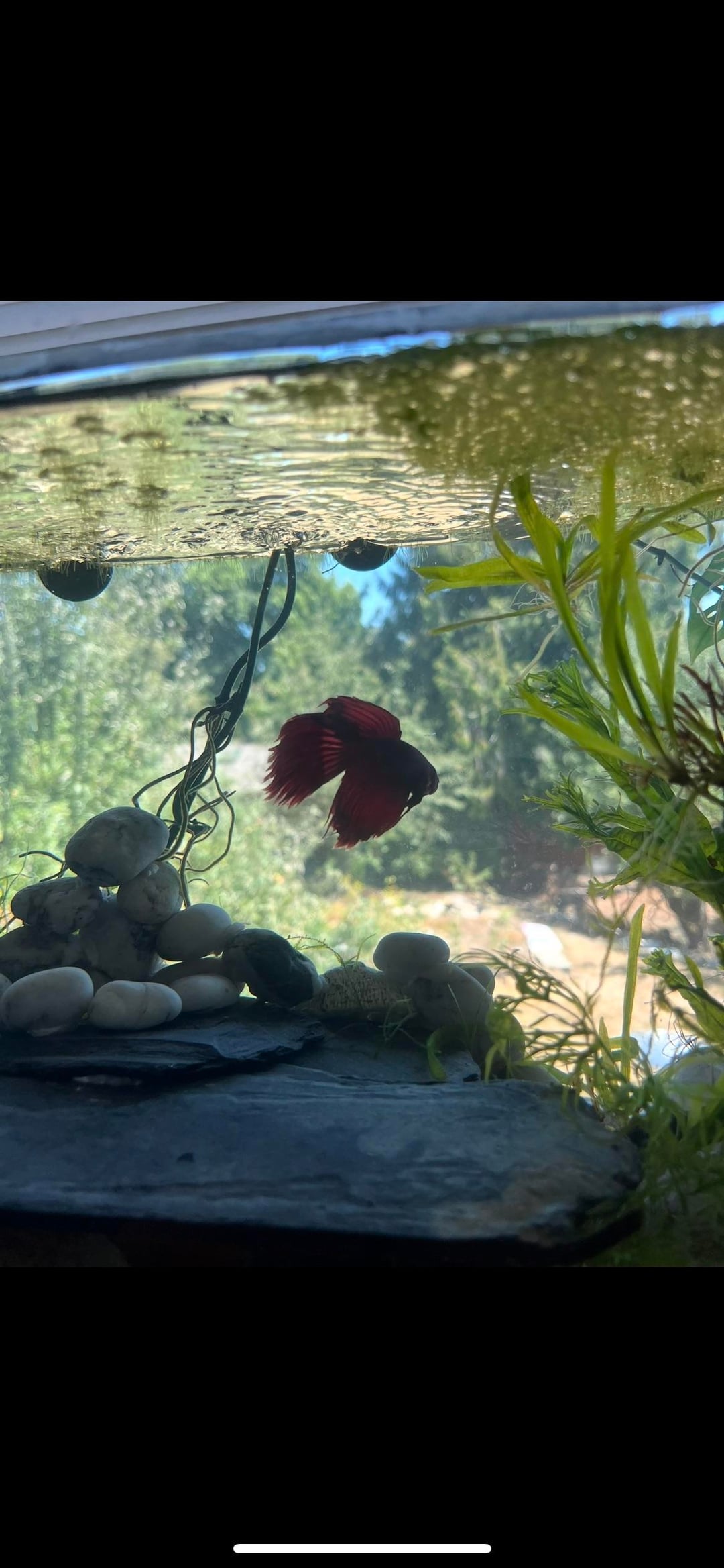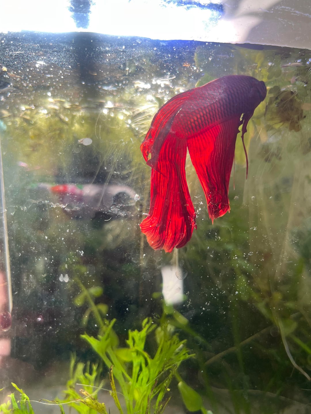 He was by a window super briefly he is not now- dw! Not sure if the fins will uncurl. Got him from a friend of a friend who had him in an unheated, untreated, half gallon container w plastic plants. Proud of his improvement!