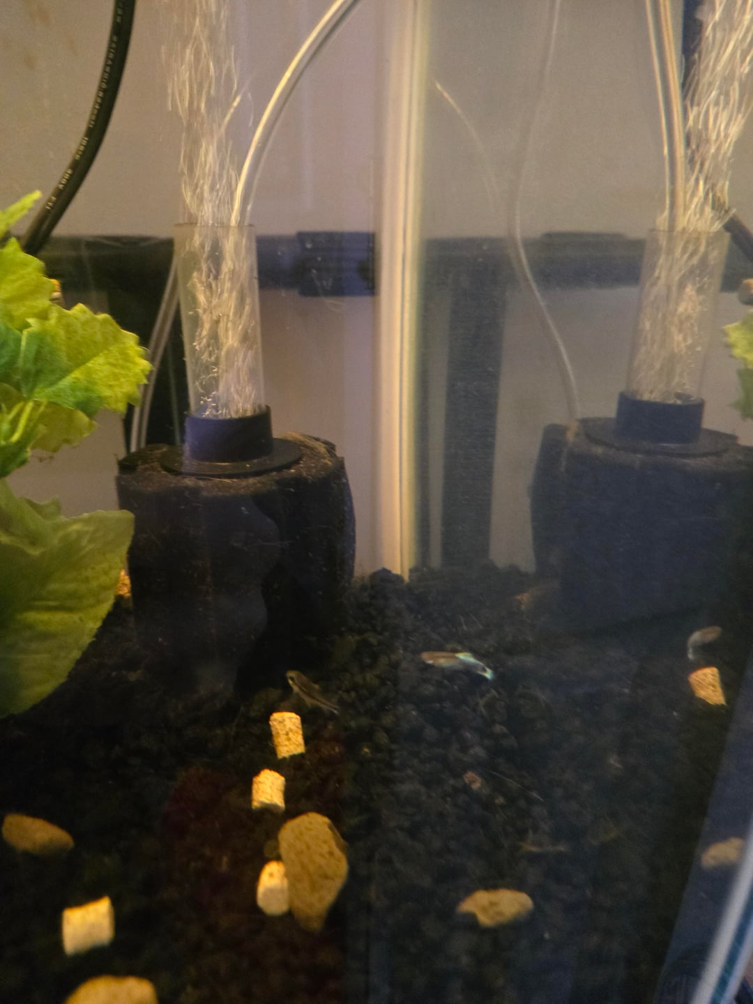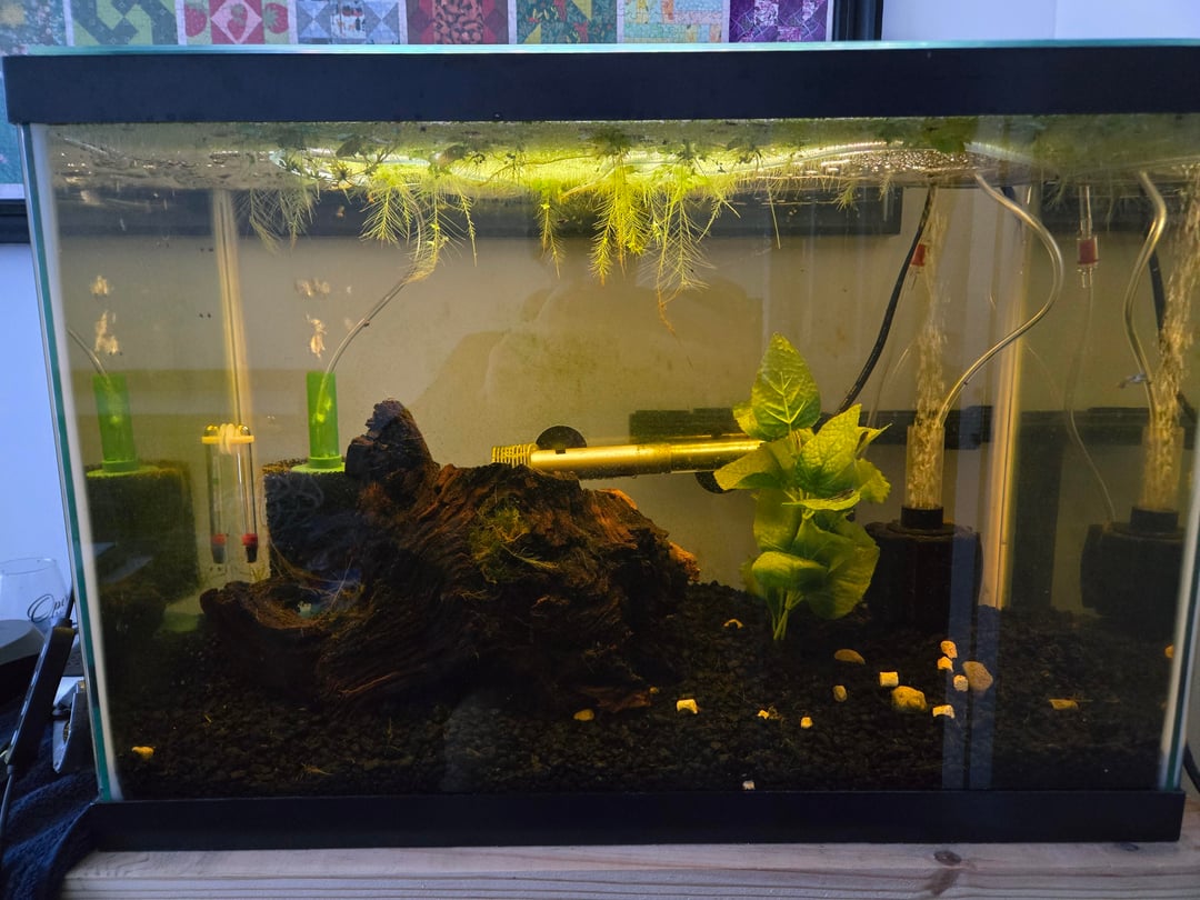 Tank info: 20gal, 78°F, 7.8pH. Ammonia and Nitrite both 0, nitrate stays below 5ppm. Tank is 5 months old and fully cycled. kH and gH are unknown. I am running 2 sponge filters for filtration, and I run a light for 12-14 hours a day. Stocking is down to 3 pygmy cories, the one mystery fish, and a whole lot of bladder snails. Plant stocking is just a crapload of duckweed.