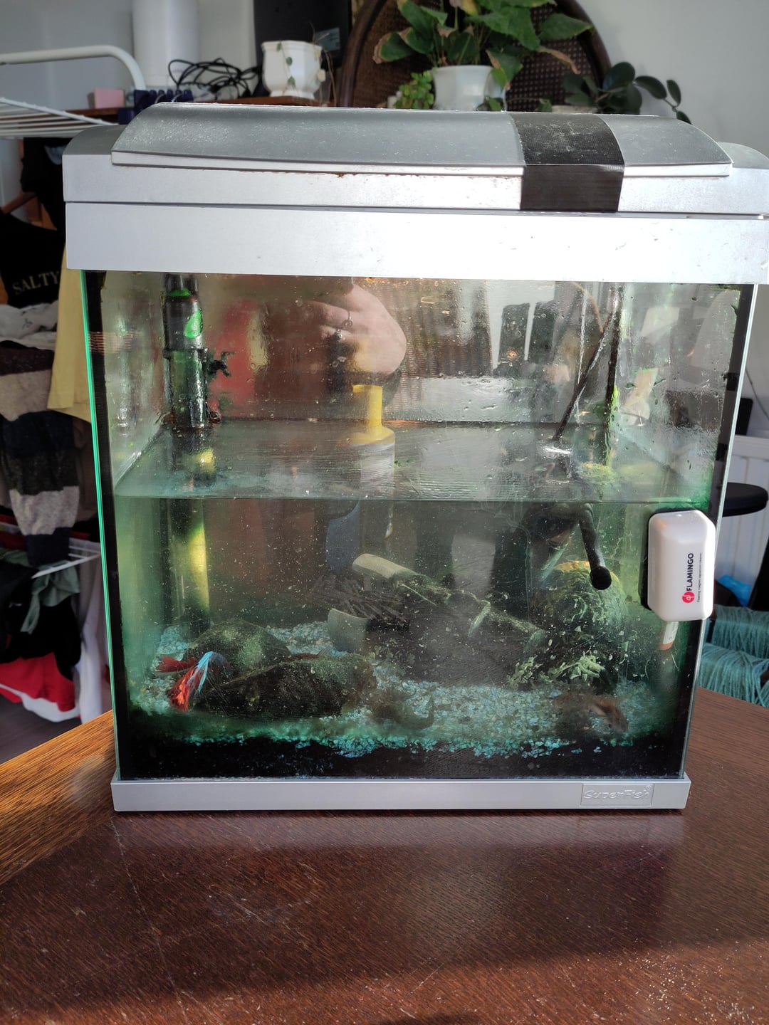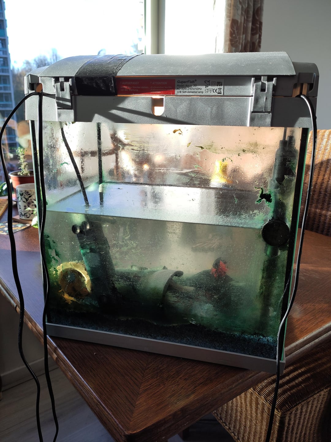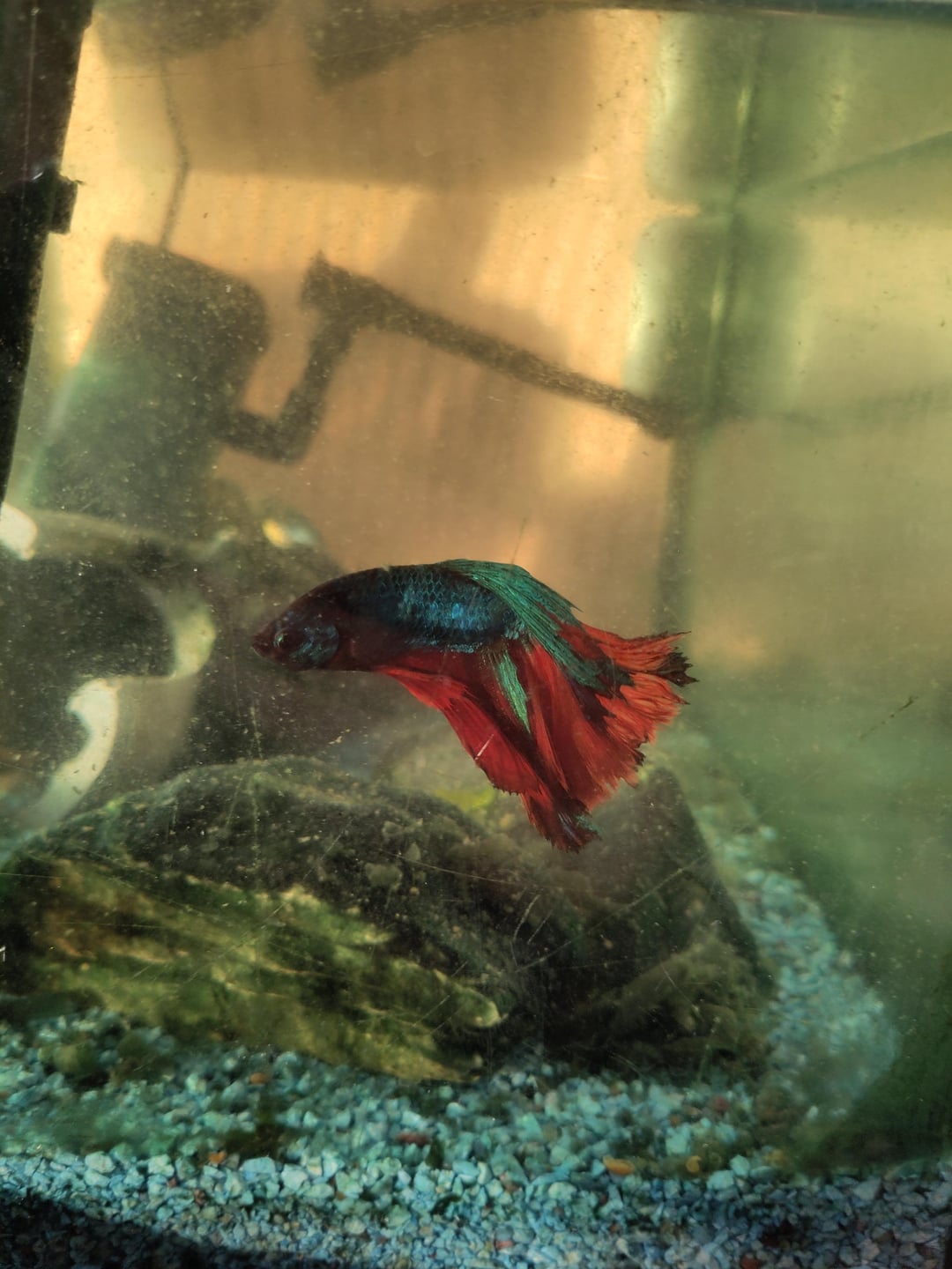 The betta looks to be healthy at least. Can’t make out his top fin from this pic. Is it torn? Don’t do anything major with the tank. You can add new water slowly and clean it slowly. One thing about bettas that i’ve found is that they don’t like too many changes in their water. Get some plants too because they go a long way to keeping the water clean.