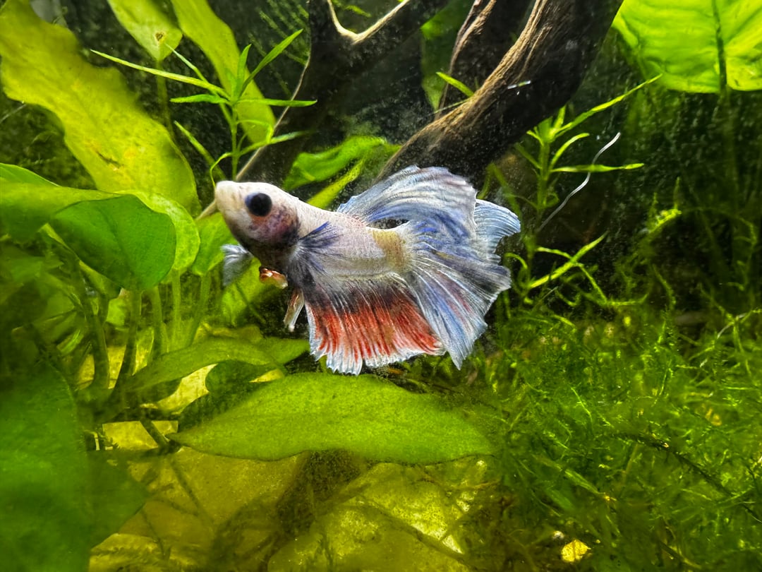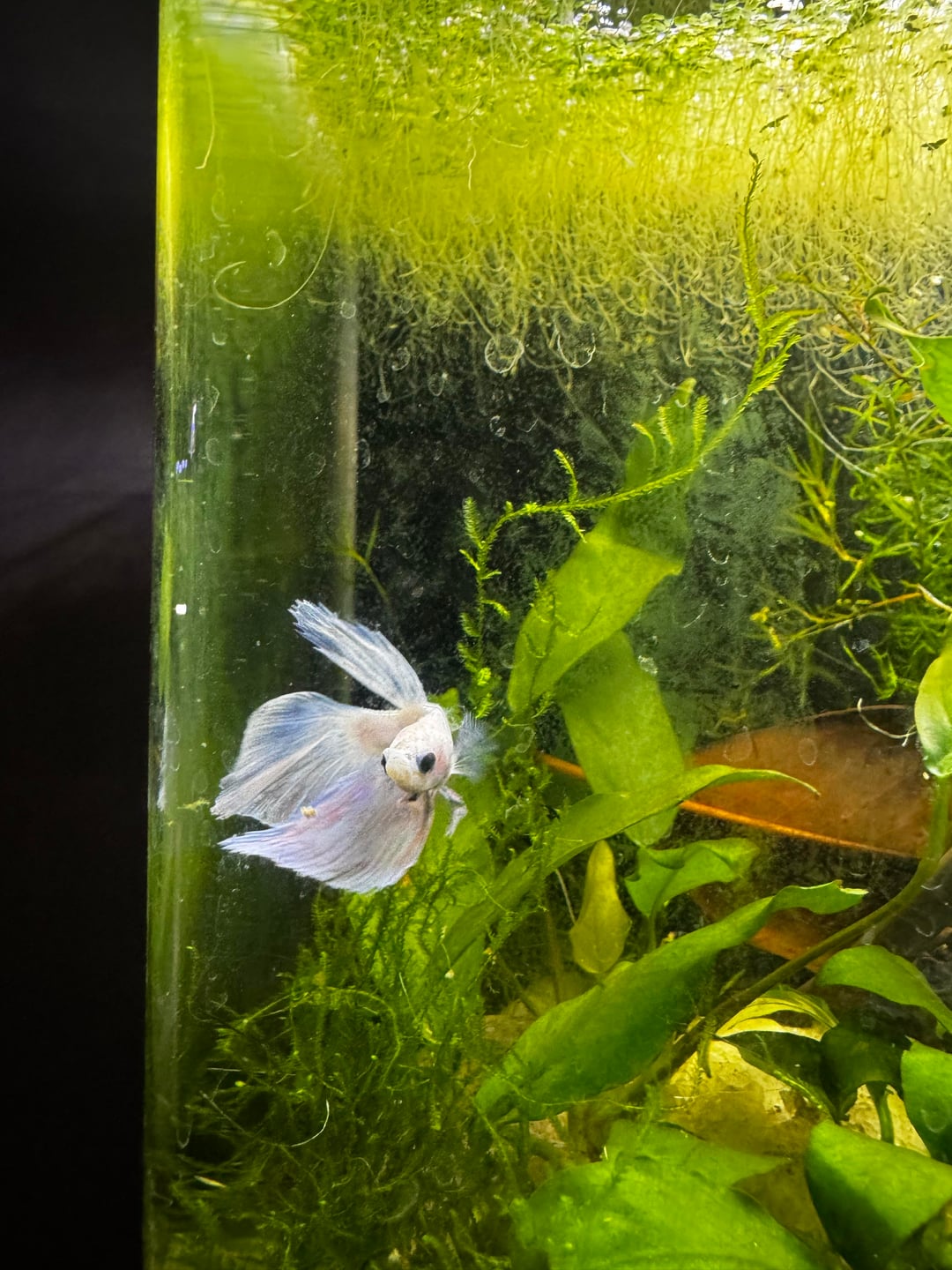 9 gallon tank, heated to 78°, I’ve been testing ammonia and nitrite with API test kits and they fall within normal ranges, the tank has been established for a year with a handful of neocaridina shrimp but betta was introduced a month ago, tomorrow. feeding a mix of tropical fish flakes and bug bites betta formula, occasional dried baby shrimp as a treat- fed every other day or every 2 days. I have all live plants and lots of moss, collected driftwoods and quartz crystals