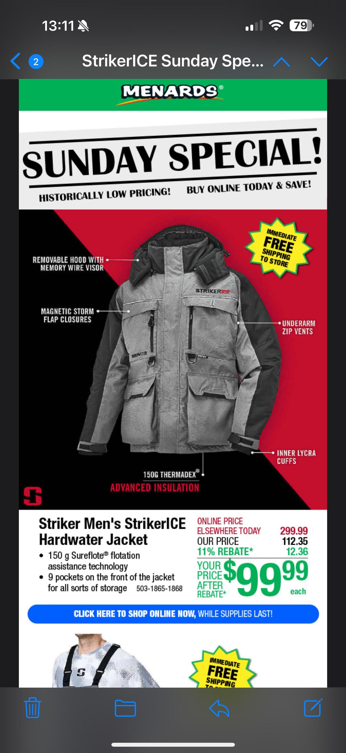 Striker Hardwater jacket and bibs at Menards, get that 11% rebate.