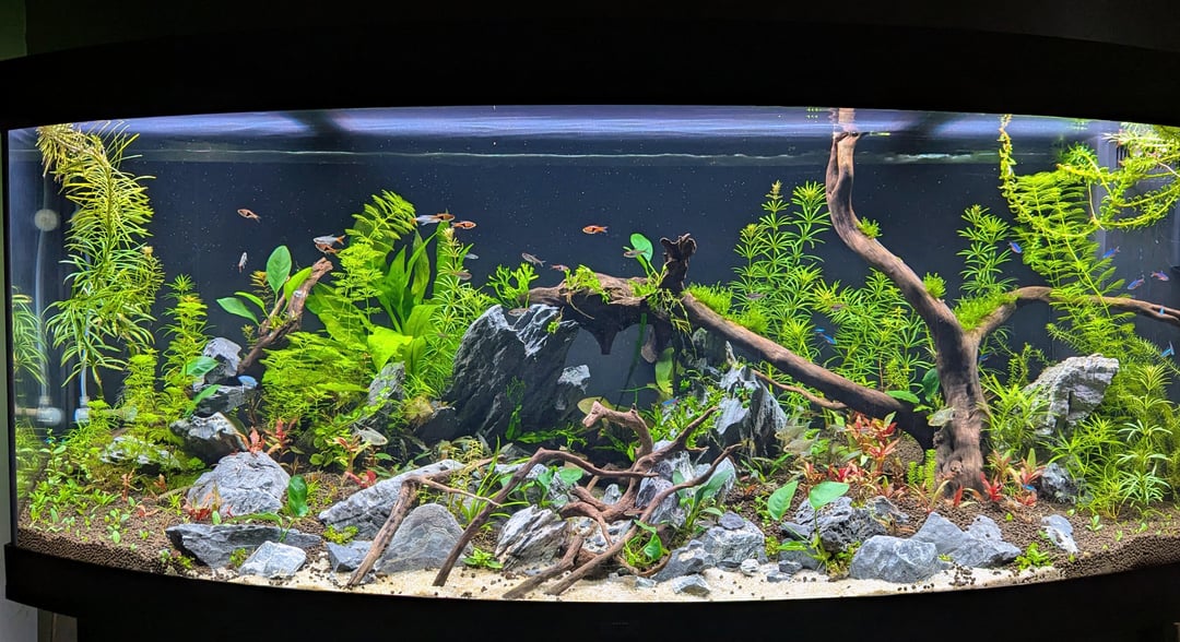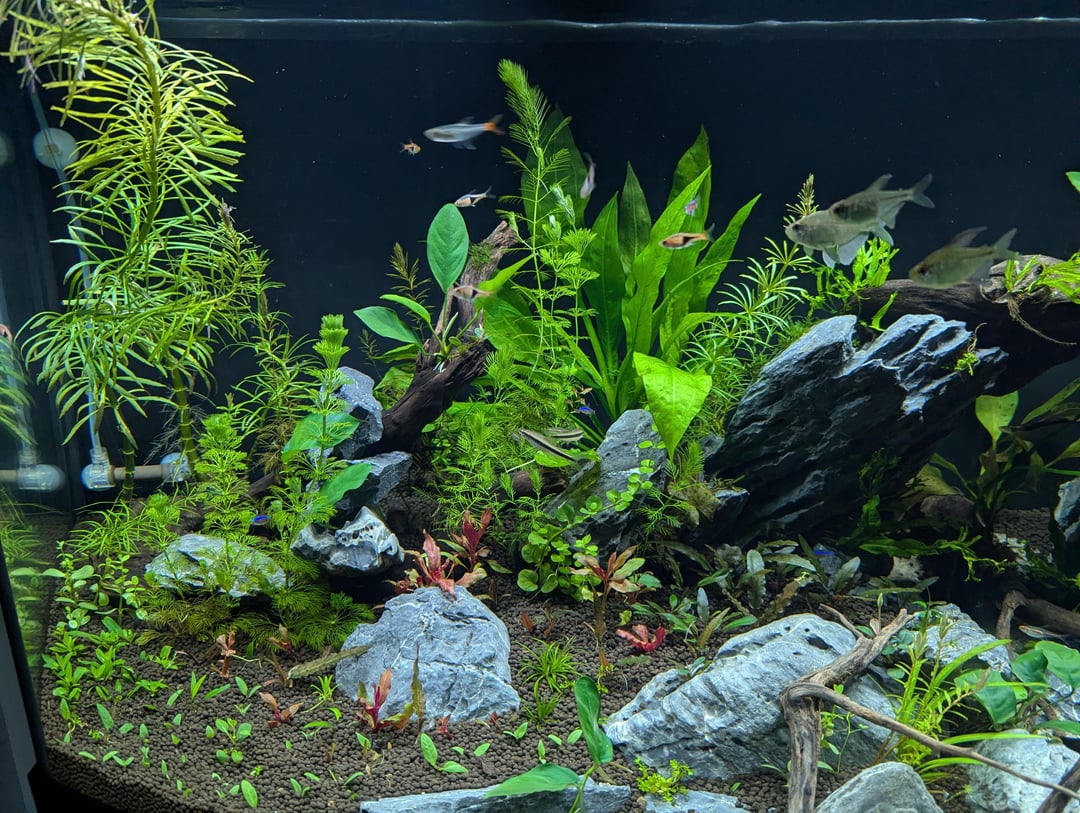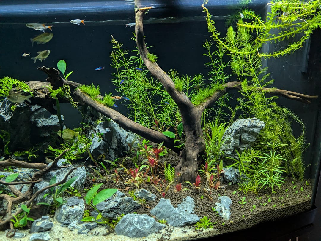 Zero algae so far. I ramped the light up really slowly, and the first fish in were bristlenose, SAE, and pygmy corys. Haven’t needed to gravel vac once — everything stays clean and breaks down nicely.