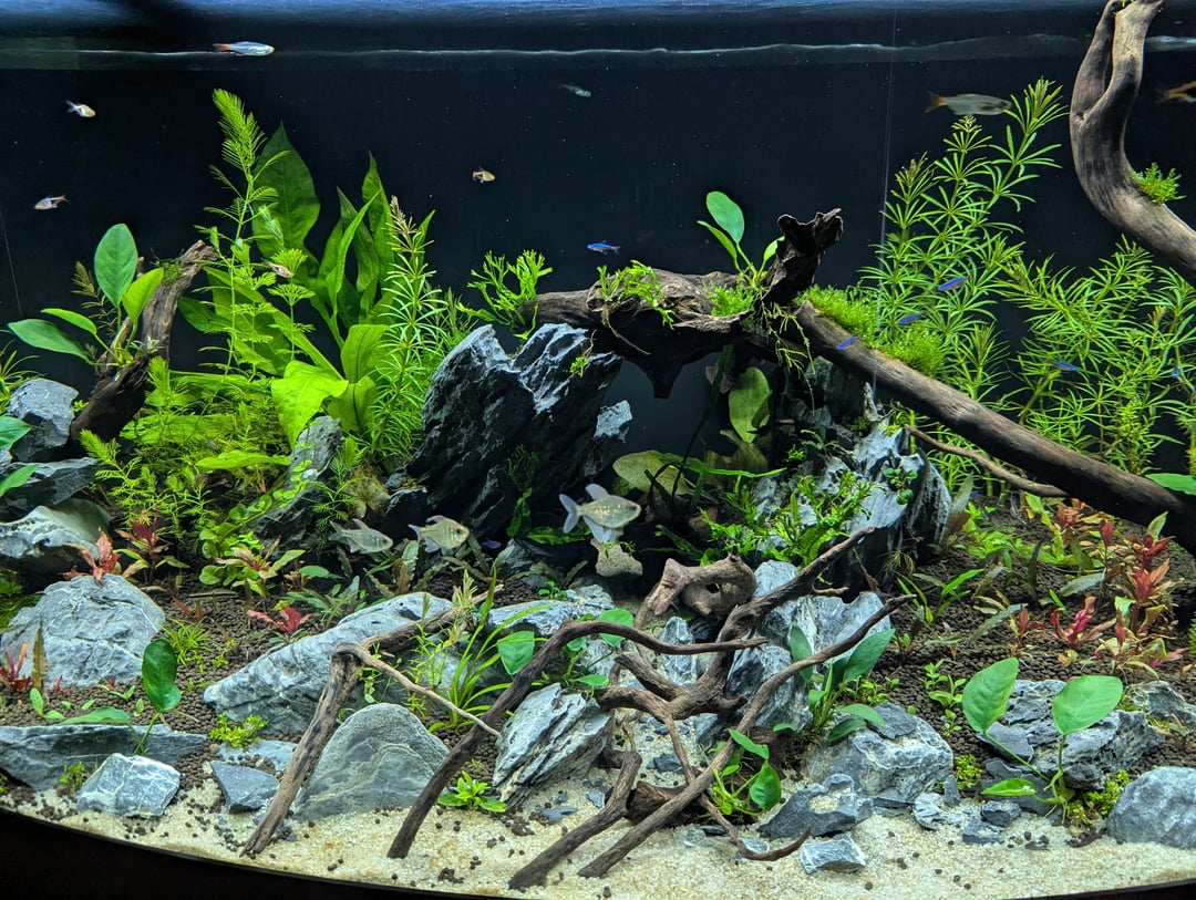 Currently sitting at around 80 fish: cardinal tetras, harlequin rasboras, bloodtail glass tetras, glowlight tetras, and platinum tetras. Their low bioload + good flow means waste gets carried straight to the filter with nothing accumulating on the substrate.