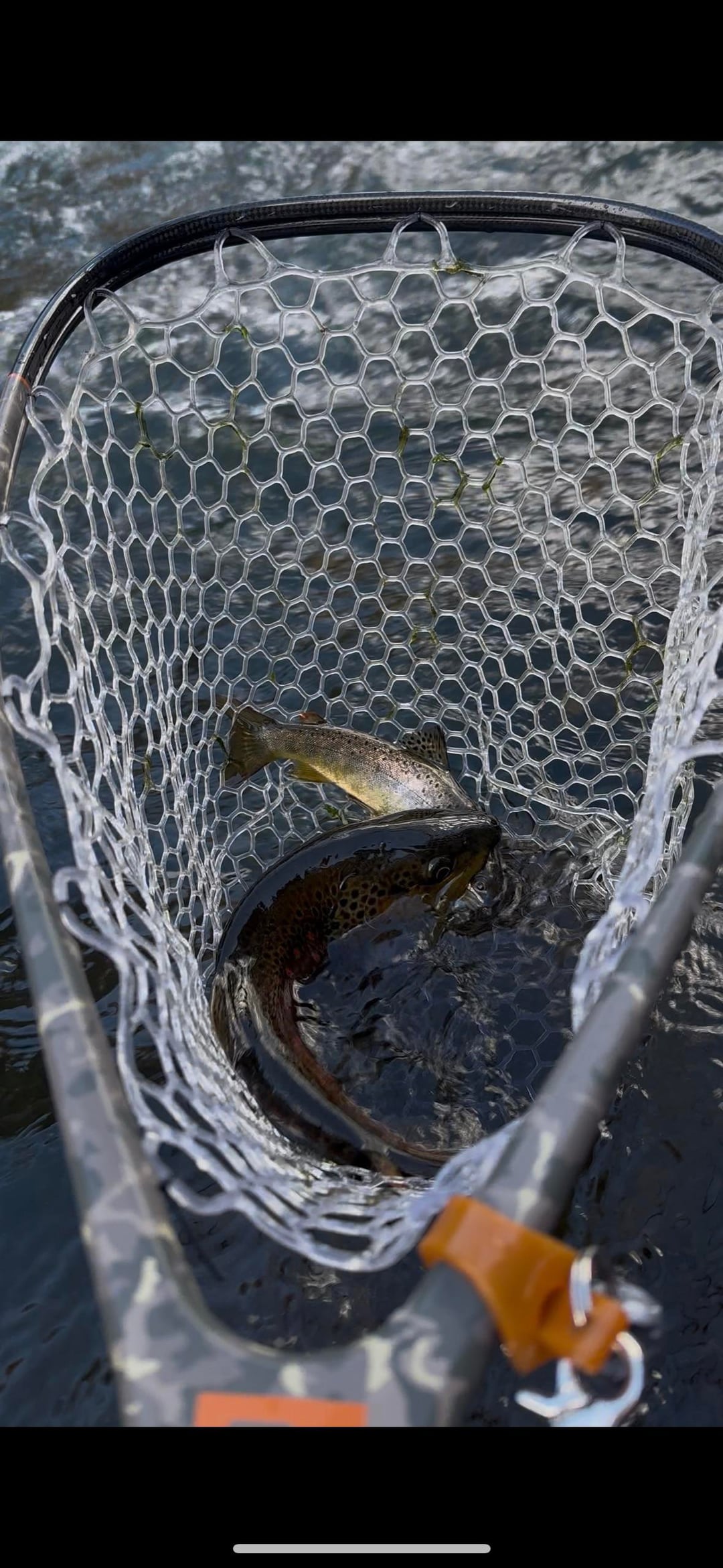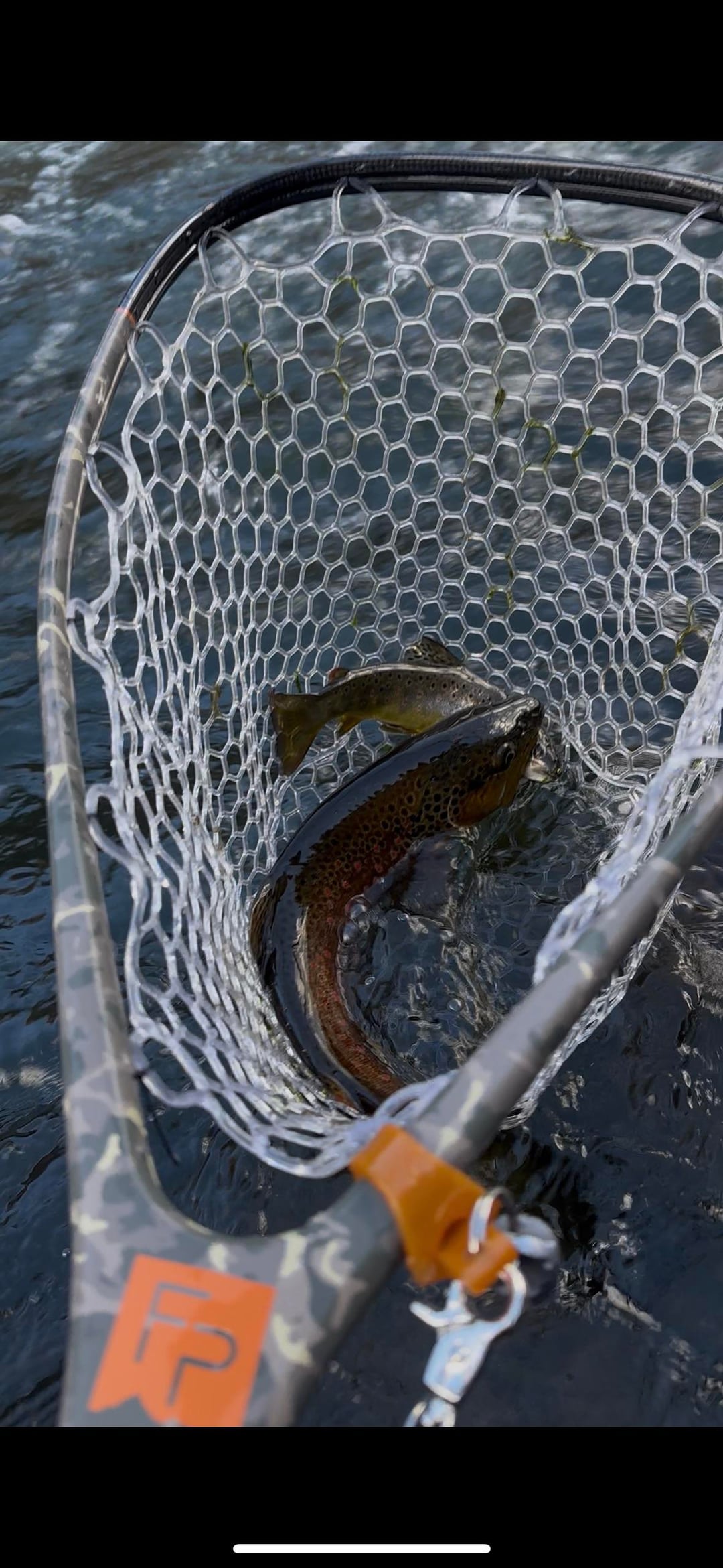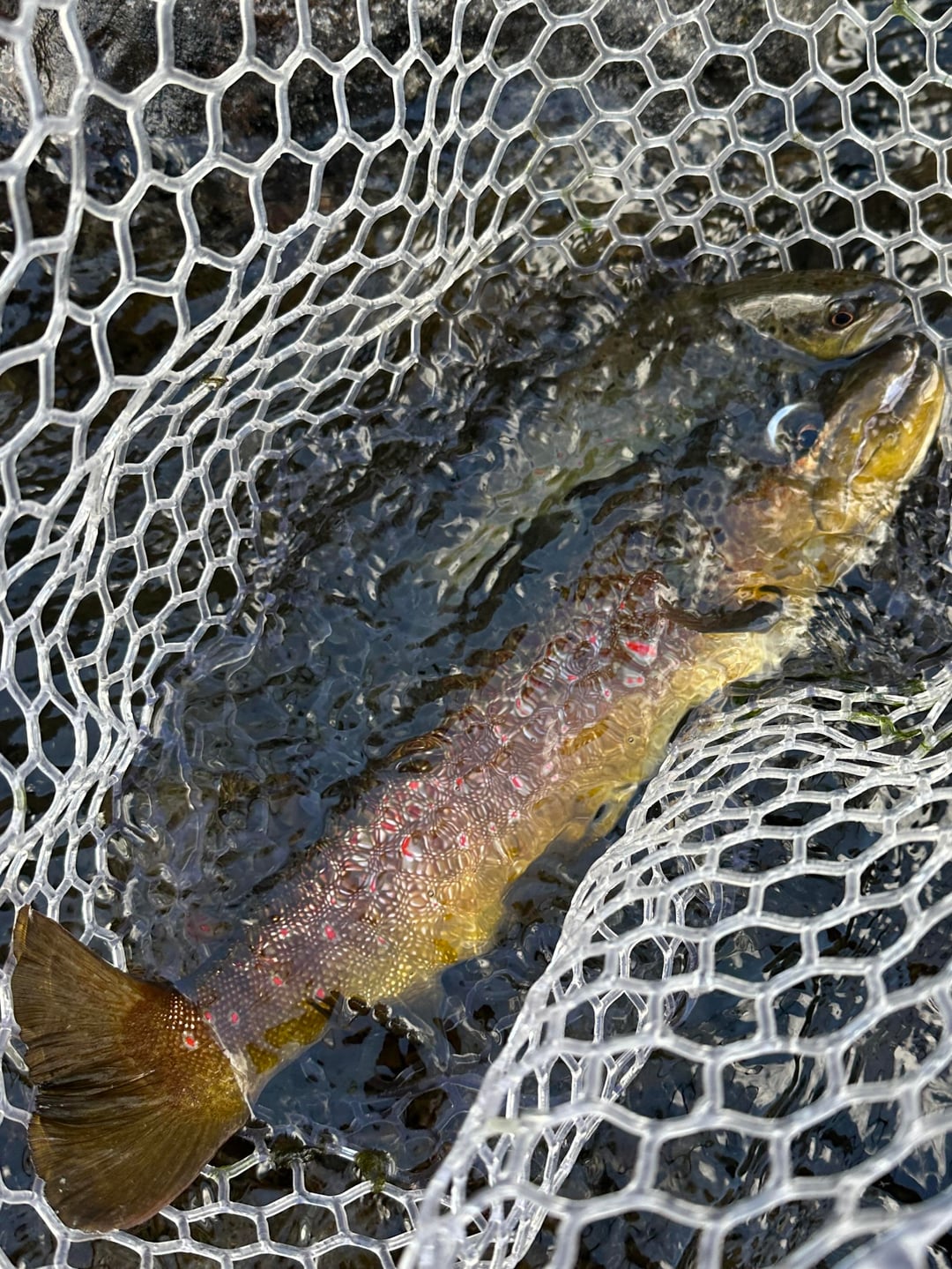 Special 2 for 1 like at the farmers market… Why didn’t this big brown just let go, since it wasn’t hooked? Instead, he stayed latched on to the smaller brown I caught and my 6x tippet was screaming for its life. It was a long and crazy fight in fast, deep water. Also, I did free the little guy – he seemed fine.