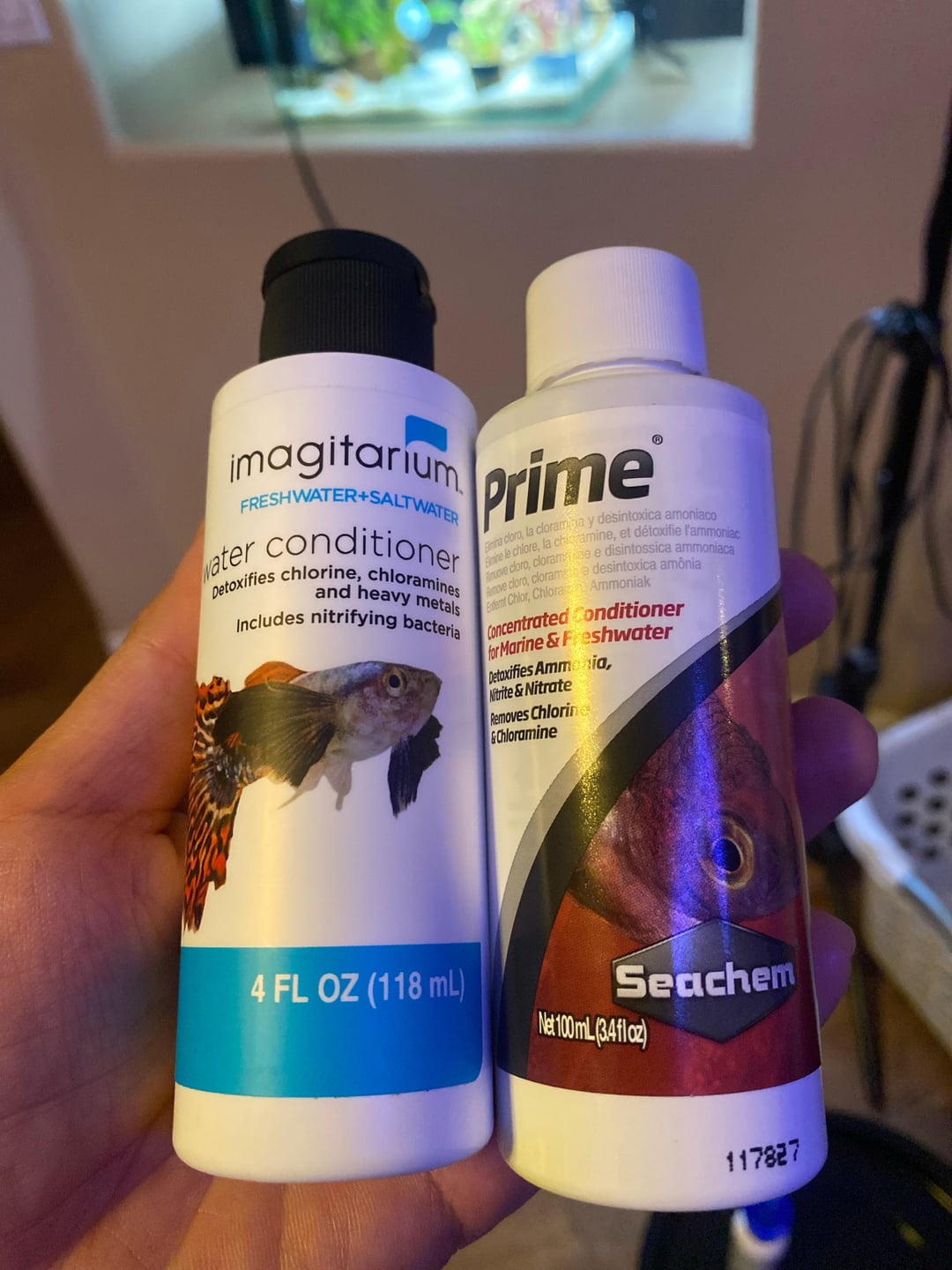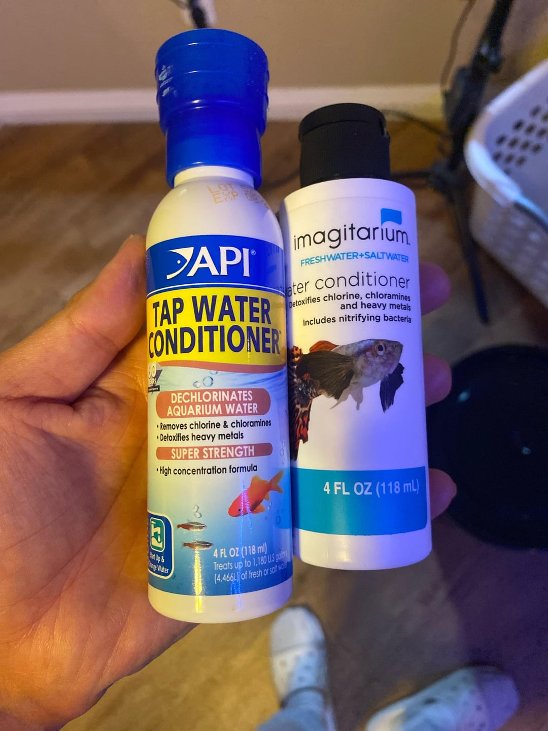 Hi everyone I’m doing my first water change25% now that it’s been a week with my betta and I’m using a 5gal bucket to have water conditioned and be ready to use when I’m doing changes. I’m using imagitaruim water conditioner and used a very small .5 of tap water conditioner in the water as well. How long should i wait till it’s ok and put that new water in the tank? Also which one is preferred i also have a prime seachem bottle but the lady who helped me out today said she’s only familiar with imagitaruim.